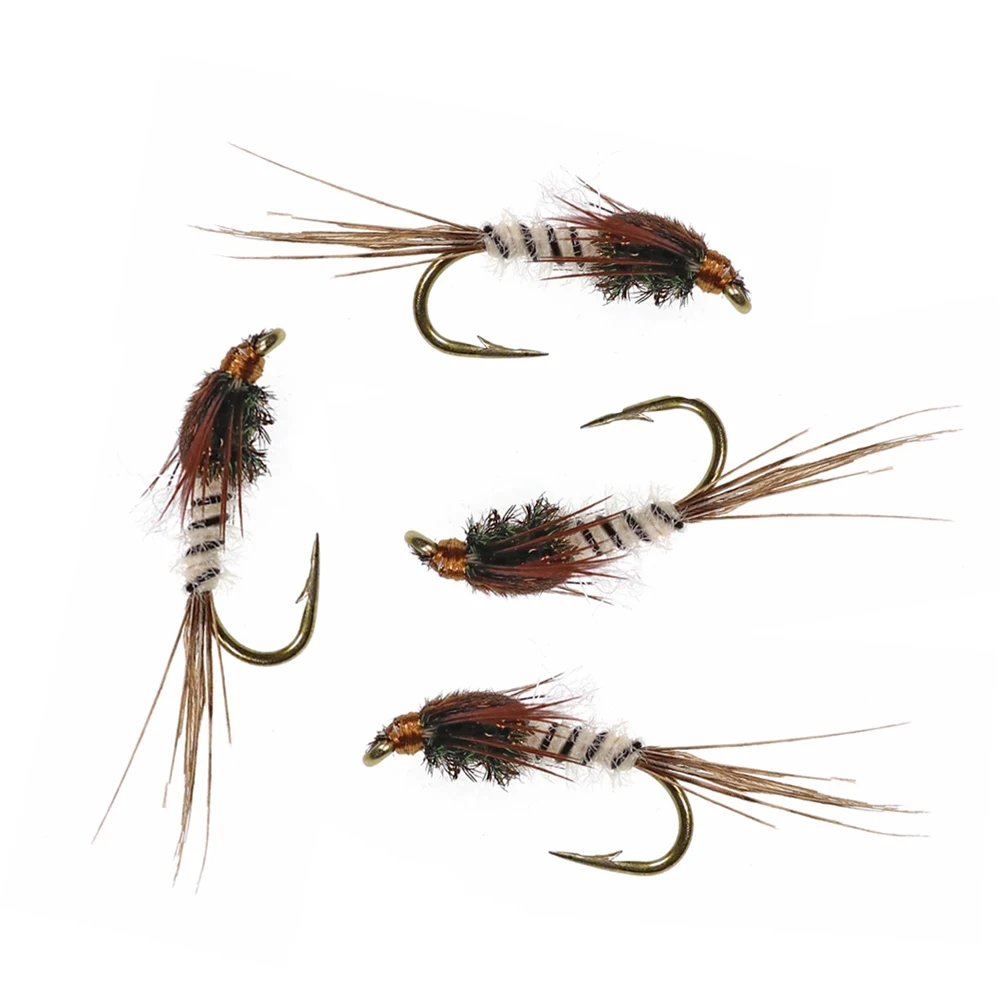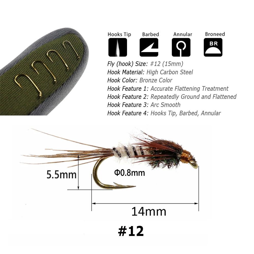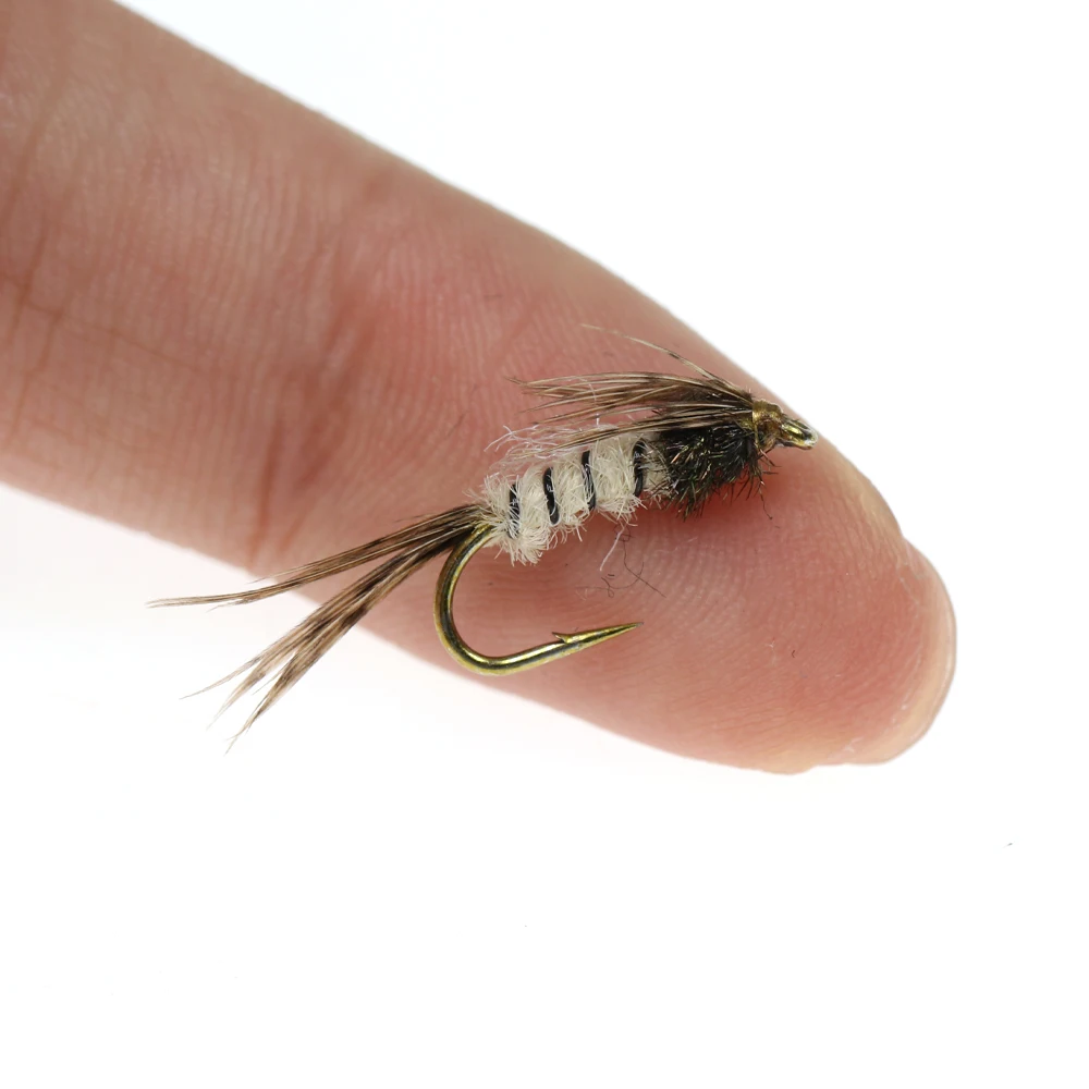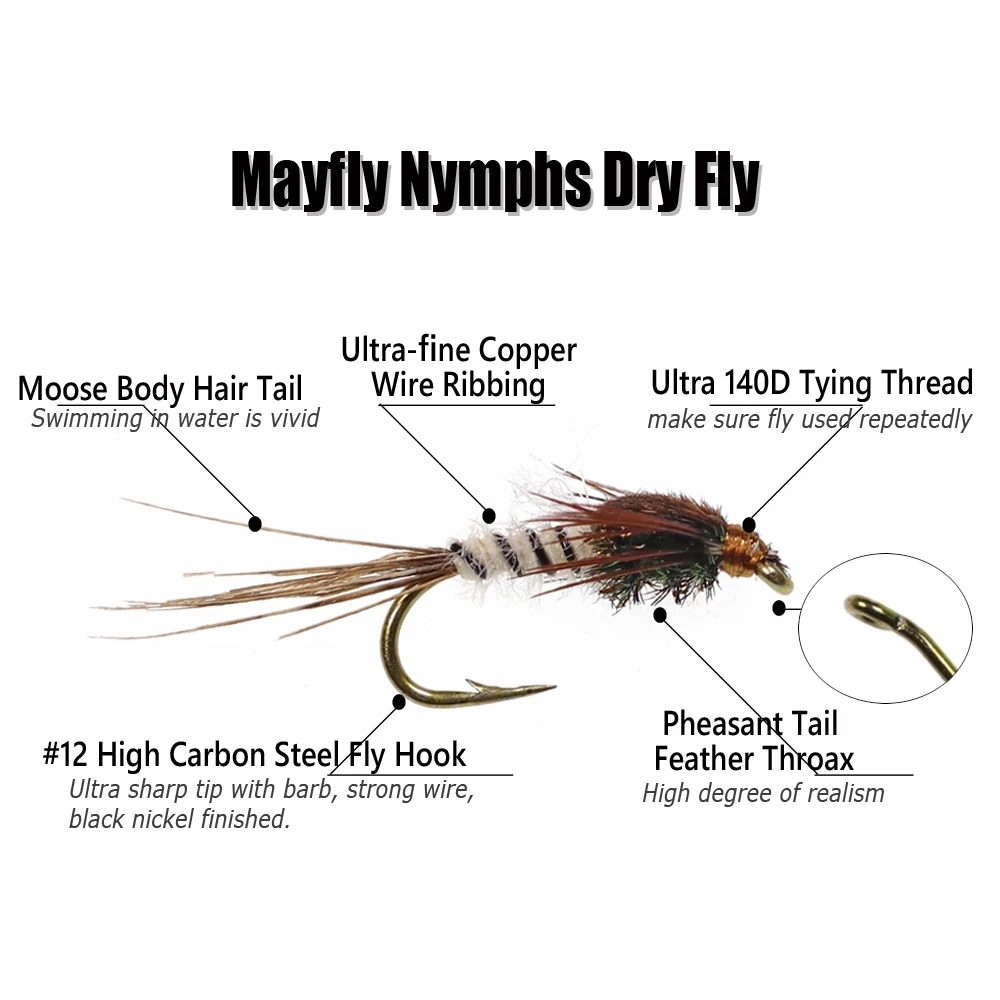 Bimoo 6PCS #12 Pluma de cola de faisán Mayfly Ninfas y emergentes Moscas secas Trucha Bass Pesca Señuelos con moscas Cebo artificial
