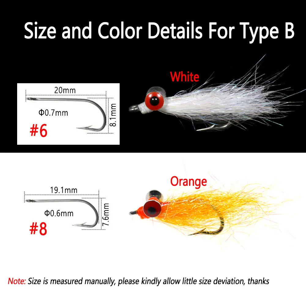 Características de la mosca: hundimiento rápido, fluorescente bajo luz UV para color naranja y verde.