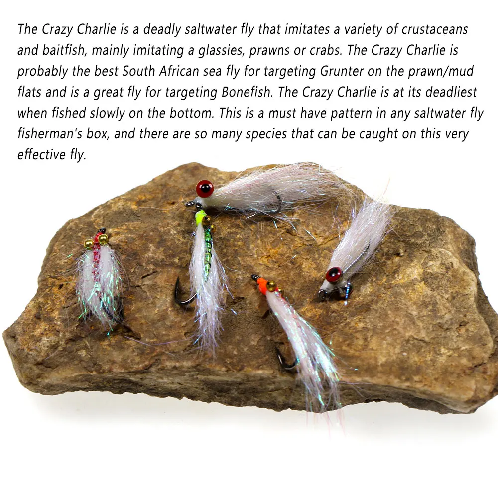 La Crazy Charlie es una mosca mortal de agua salada que imita una variedad de crustáceos y cebos, principalmente imitando vasos, gambas o cangrejos. La Crazy Charlie es probablemente la mejor mosca Marina Sudafricana para apuntar a Grunter en los planos de gamba/barro y es una gran mosca para apuntar a Bonefish. El Crazy Charlie es más mortal cuando se pesca lentamente en el fondo. Este es un patrón imprescindible en cualquier caja de pescador con moscas de agua salada, y hay muchas especies que se pueden capturar con esta mosca tan efectiva.