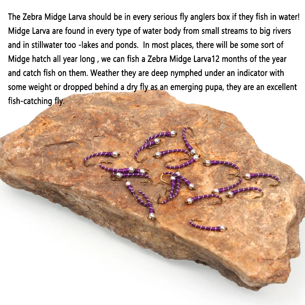 ¡La Zebra Midge Larva debe estar en todas las cajas de pescadores serios si pescan en el agua! Las larvas de mosquitos se encuentran en todo tipo de cuerpos de agua, desde pequeños arroyos hasta grandes ríos y también en aguas tranquilas: lagos y estanques. En la mayoría de los lugares, habrá algún tipo de escotilla Midge durante todo el año, podemos pescar una larva Zebra Midge 12 meses del año y pescar en ellos. Son ninfas profundas bajo un indicador con algo de peso o caídas detrás de una mosca seca como una pupa emergente, son una excelente mosca para la captura de peces.