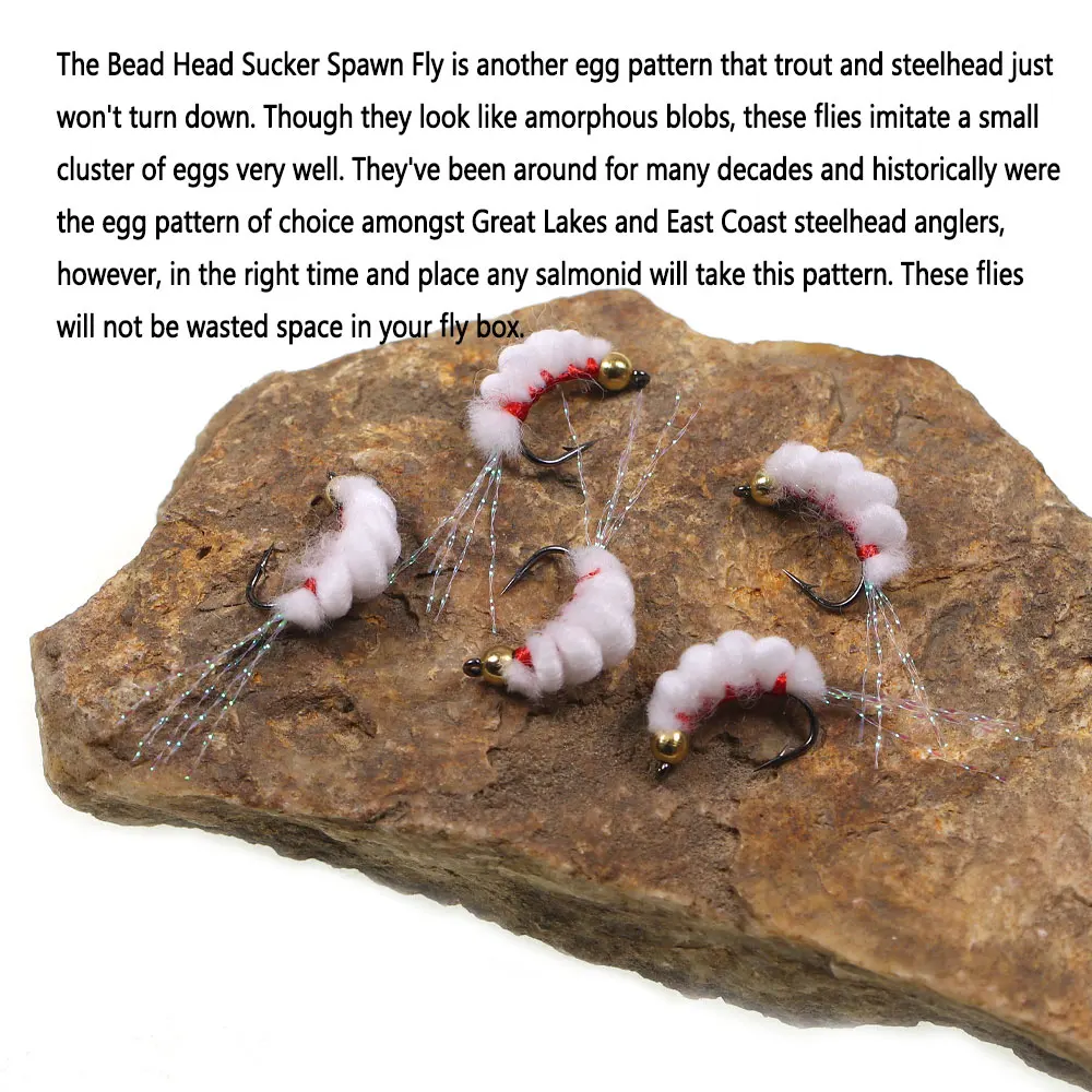 El Bead Head Sucker Spawn Fly es otro patrón de huevos que la trucha y la trucha arco iris simplemente no rechazan. Aunque parecen gotas amorfas, estas moscas imitan muy bien un pequeño grupo de huevos. Han existido durante muchas décadas e históricamente fueron el patrón de huevo elegido entre los pescadores de trucha arco iris de los Grandes Lagos y la costa este, sin embargo, en el momento y el lugar adecuados, cualquier salmónido tomará este patrón. Estas moscas no desperdiciarán espacio en su caja de moscas.