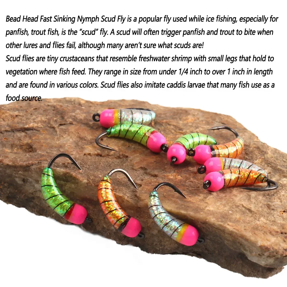 ----Bead Head Fast Sinking Nymph Scud Fly is a popular fly used while ice fishing, especially for panfish, trout fish, is the “scud” fly. A scud will often trigger panfish and trout to bite when other lures and flies fail, although many aren’t sure what scuds are! Scud flies are tiny crustaceans that resemble freshwater shrimp with small legs that hold to vegetation where fish feed. They range in size from under 1/4 inch to over 1 inch in length and are found in various colors. Scud flies also imitate caddis larvae that many fish use as a food source.