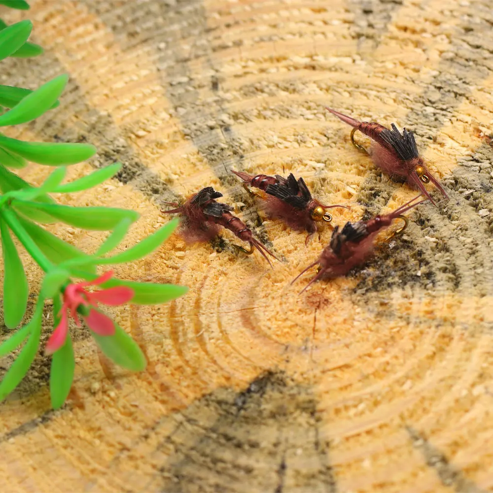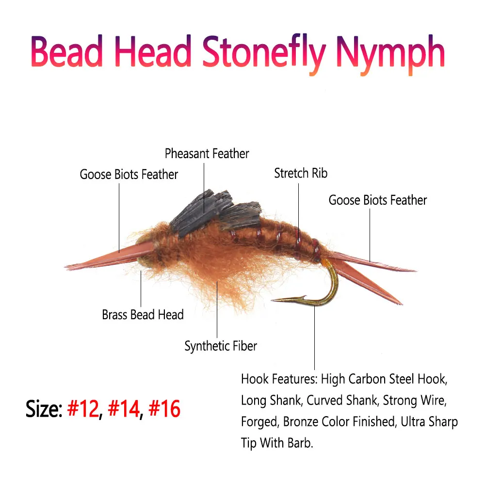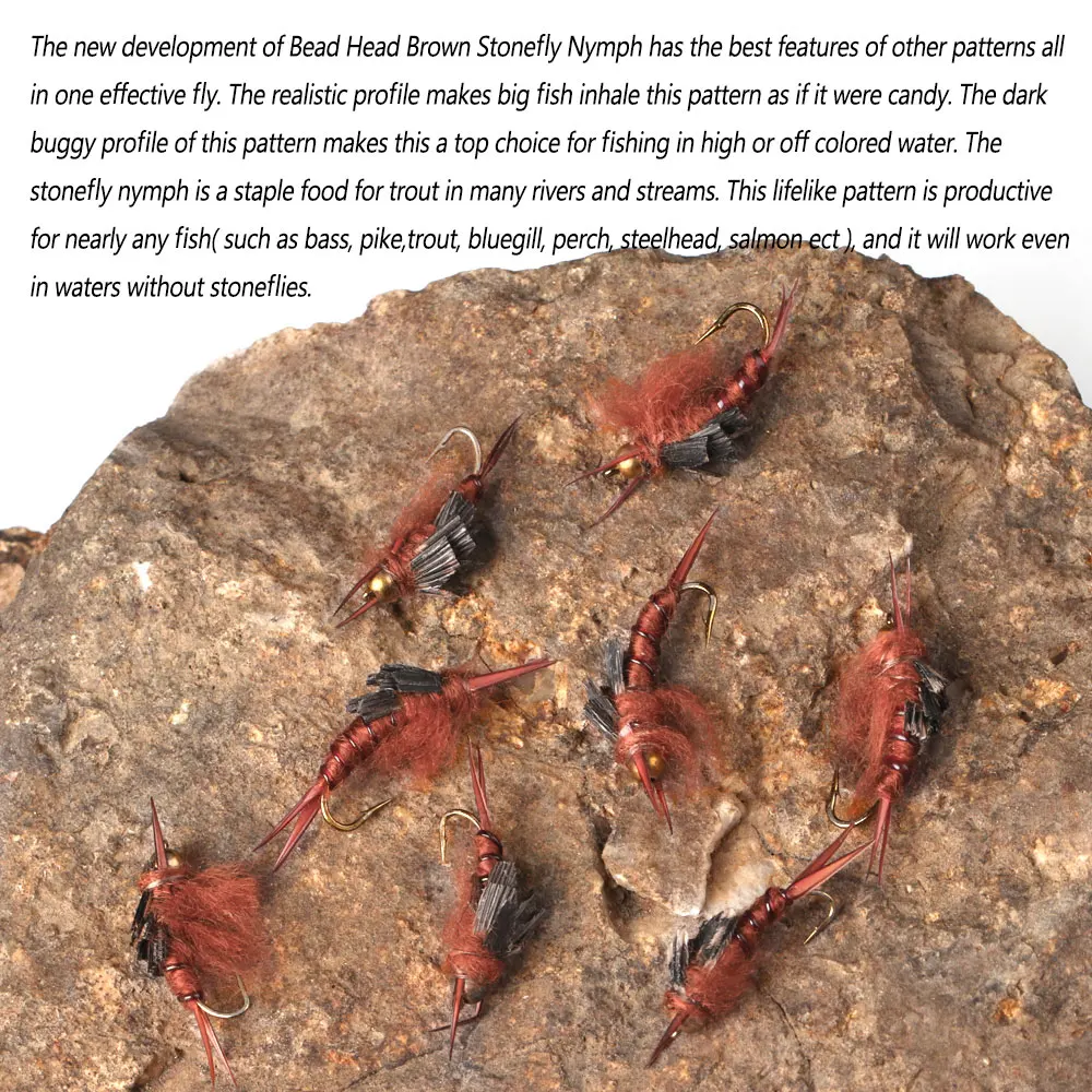 El nuevo desarrollo de Bead Head Brown Stonefly Nymph tiene las mejores características de otros patrones, todo en una sola mosca efectiva. El perfil realista hace que los peces grandes inhalen este patrón como si fuera caramelo. El perfil de buggy oscuro de este patrón lo convierte en una opción superior para pescar en agua de color alto o apagado. La ninfa stonefly es un alimento básico para truchas en muchos ríos y arroceras. Este patrón realista es productiva para casi cualquier pez (como lubina, lucio, trucha, bluetrim, perca, steelhead, salmón, etc.), y funcionará incluso en aguas sin piedras.