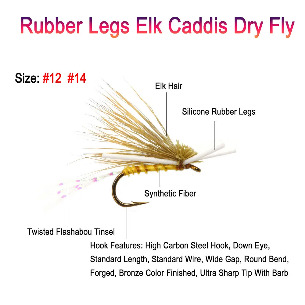 El Elk Hair Caddis es una excelente mosca para agua de bolsillo o agua en movimiento rápido.El pelo de alce lo convierte en una mosca muy flotante y flotante.Este Caddis de pelo de alce con patas de goma añade movimiento, flotación y estabilidad al patrón ya probado.Rubber Leg Elk Hair Caddis puede capturar con éxito una serie de peces, pero especialmente truchas, como les encanta perseguir moscas secas muy flotantes.
