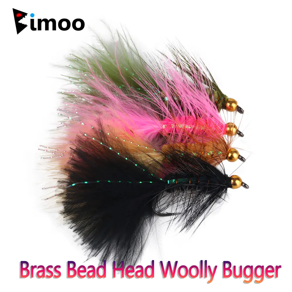 Bimoo 5 uds #6 cabeza de cuentas de latón Bugger lanudo hundimiento rápido marabú pluma cola Streamer Fly Steelhead trucha Señuelos de Pesca cebos