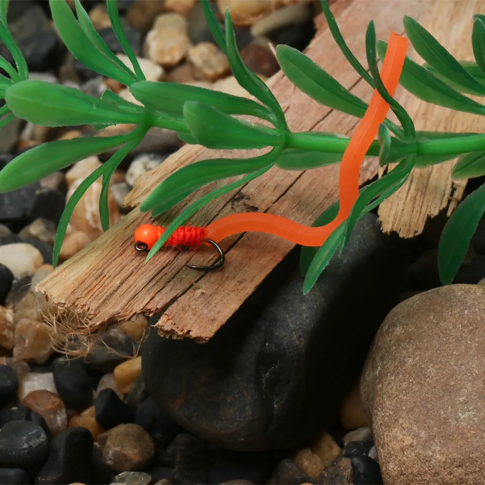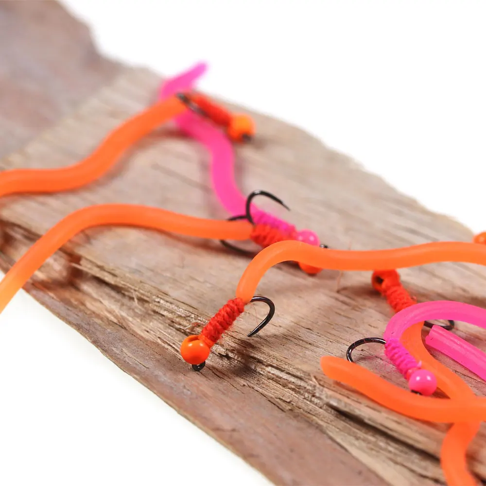 Ha cambiado la vida de muchos pescadores de mosca en los últimos dos años. La sensación gomosa del material del gusano le da al pescador una gran confianza de que la mosca es codiciosamente inhalada por la trucha, la lubina, la carpa, la agalla azul y otros peces. Estas moscas son perfectas para pescar en aguas manchadas, ya sea como parte de un aparejo en tándem o solas. El peso ayuda a que la mosca llegue a la posición de presentación rápidamente para que los peces puedan hundir sus dientes en la comida abundante. Estas moscas Squirmy están atadas en anzuelos de Ninfa afilados y fuertes sin púas. Esto ayuda a evitar enganchar el fondo del río y da como resultado menos enganches.
