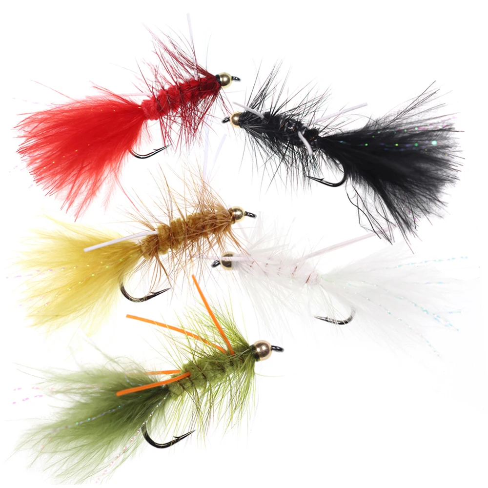 Bimoo 5 uds Woolly Bugger Streamers Fly cabeza de latón patas de goma pesca moscas Lucio lubina Arco Iris trucha Señuelos de Pesca Rojo Negro Blanco Oliva marrón