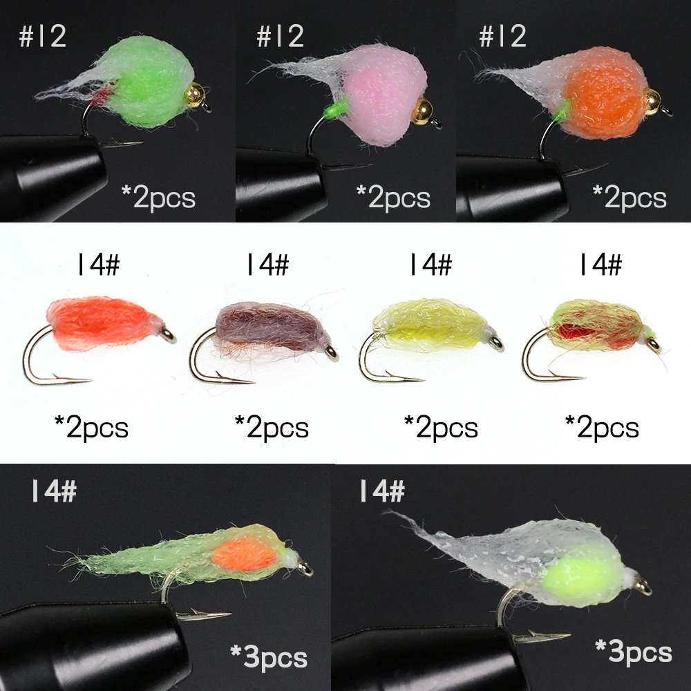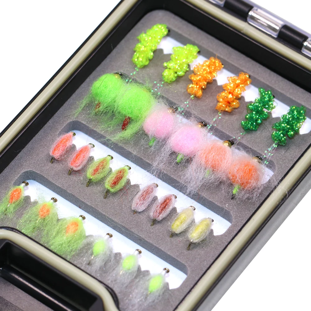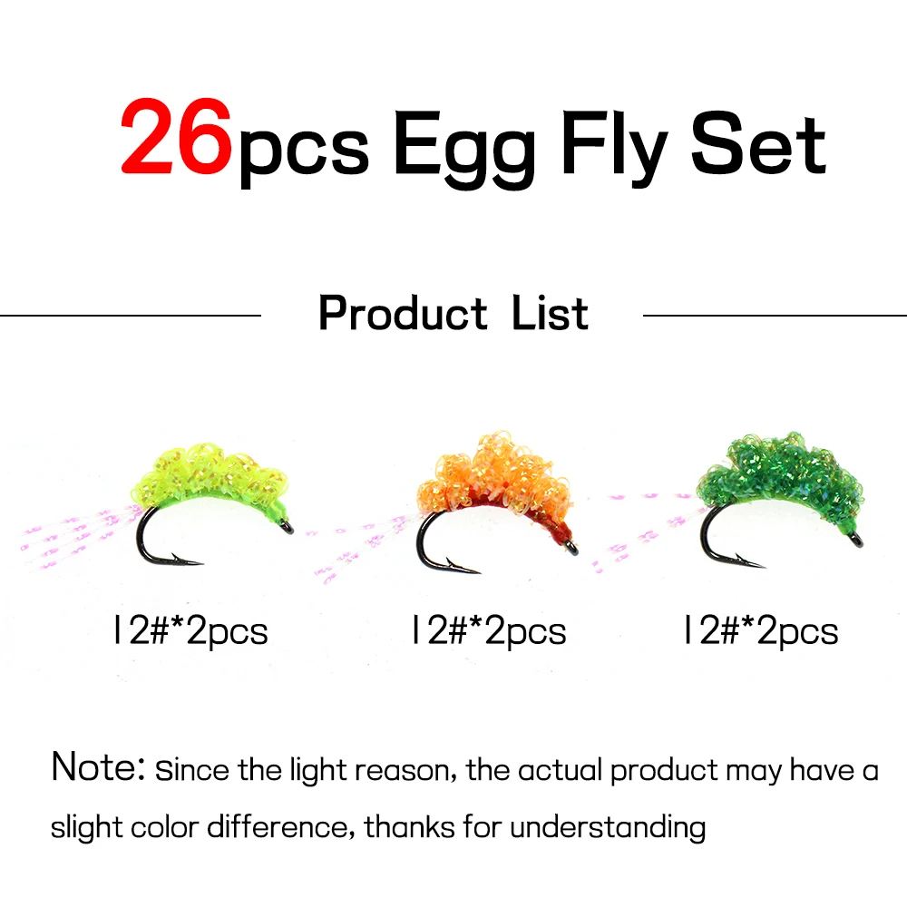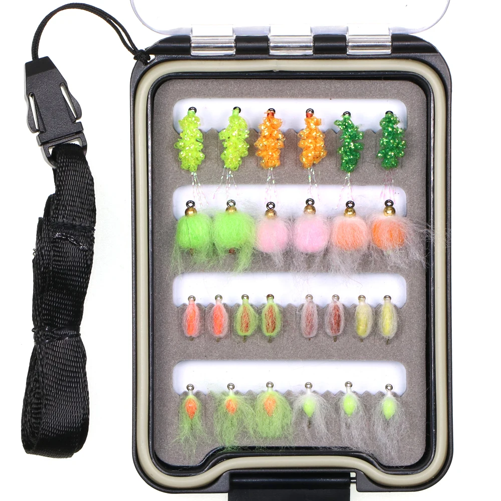 Bimoo 26 unids/set patrón mixto cabeza de cuentas de latón/sin cuentas huevo mosca #12 #14 gancho Caja impermeable trucha salmón pesca señuelo cebo