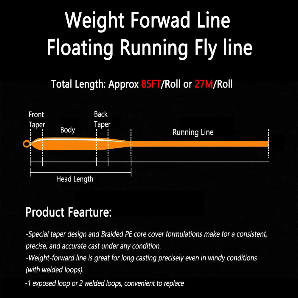 Bimoo WF-3F ~ WF-5F 85FT Línea de avance de peso Línea de mosca flotante Línea de mosca para correr Línea principal de pesca con mosca cónica bucles soldados delanteros