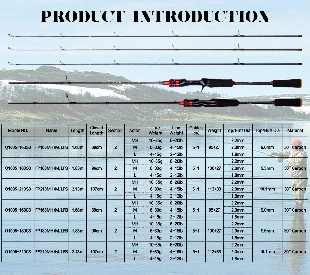 *With two-section design, the fishing rod has perfect tuneability, with single, double and triple options, suitable for different weights and different types of baits, suitable for various *Appearance is made of environmentally friendly high-performance oil and water;