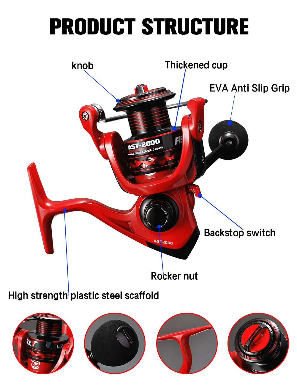6. Bloqueo instantáneo anti-retroceso, hardware de acero inoxidable, mango EVA.