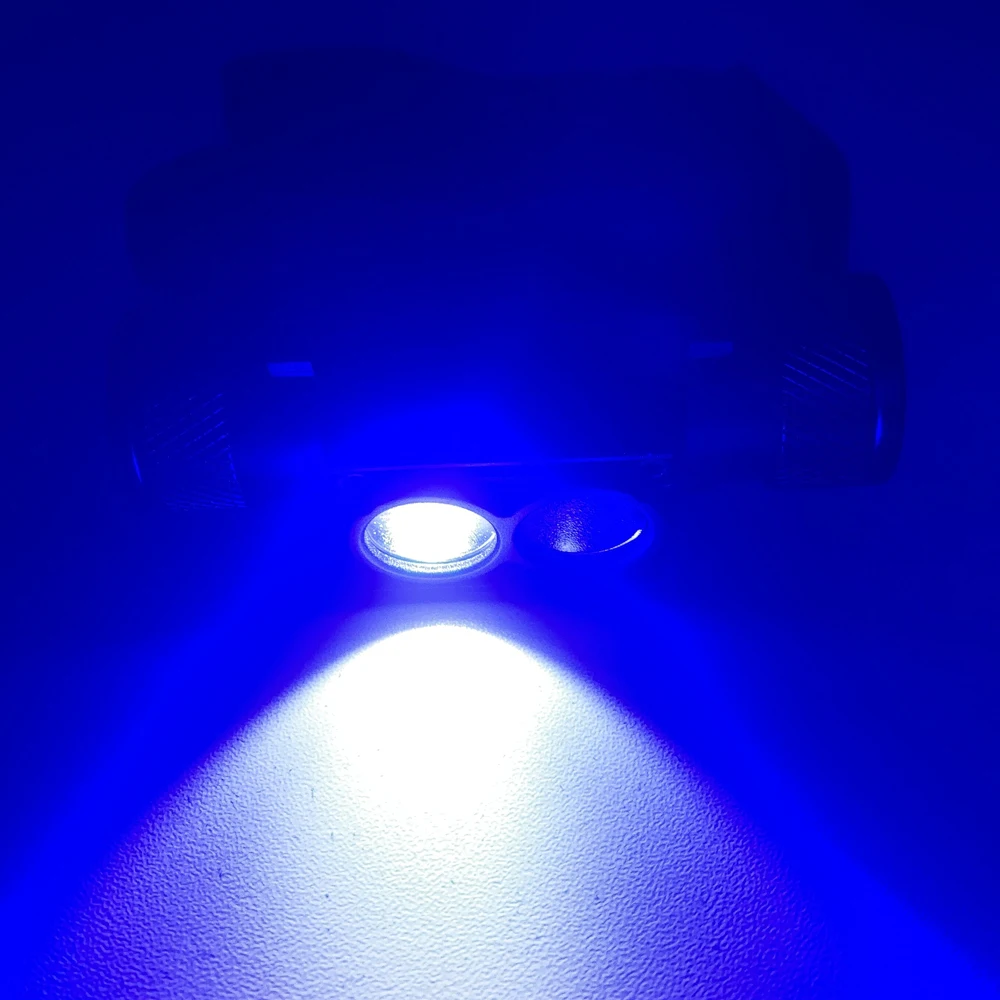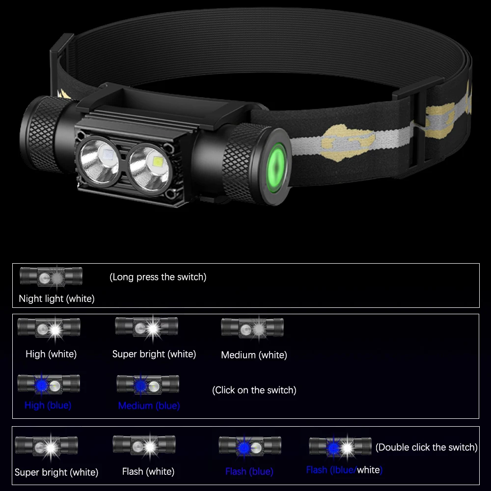 3.Doble clic en el interruptor: Súper brillante (blanco)-Flash (blanco)-Flash (azul)-Flash (blanco-azul)