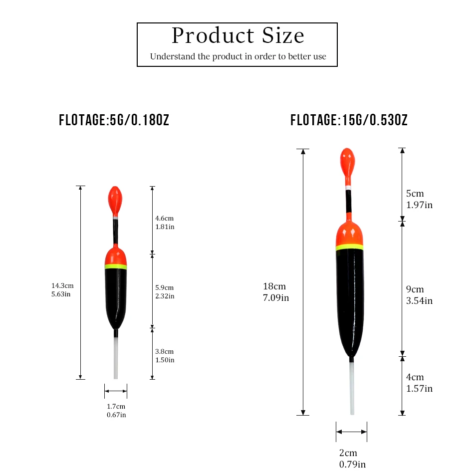 4. Especificaciones de los bobbers antideslizantes: hechos de madera de balsa, longitud del cuerpo x longitud total: 9 cm/3,54 pulgadas x 18 cm/7,09 pulgadas; 6 cm/2,32 pulgadas x 14,3 cm/5,63 pulgadas, peso (puntos): 4,6 g/0,16 oz, flotación: 15 g/0,53 oz; 5 g/0,18 oz, el paquete incluye: 5 unidades por lote. 5 colores como se muestran las imágenes para elegir. Los flotadores antideslizantes son ideales para la pesca de trucha y pez Crappie.