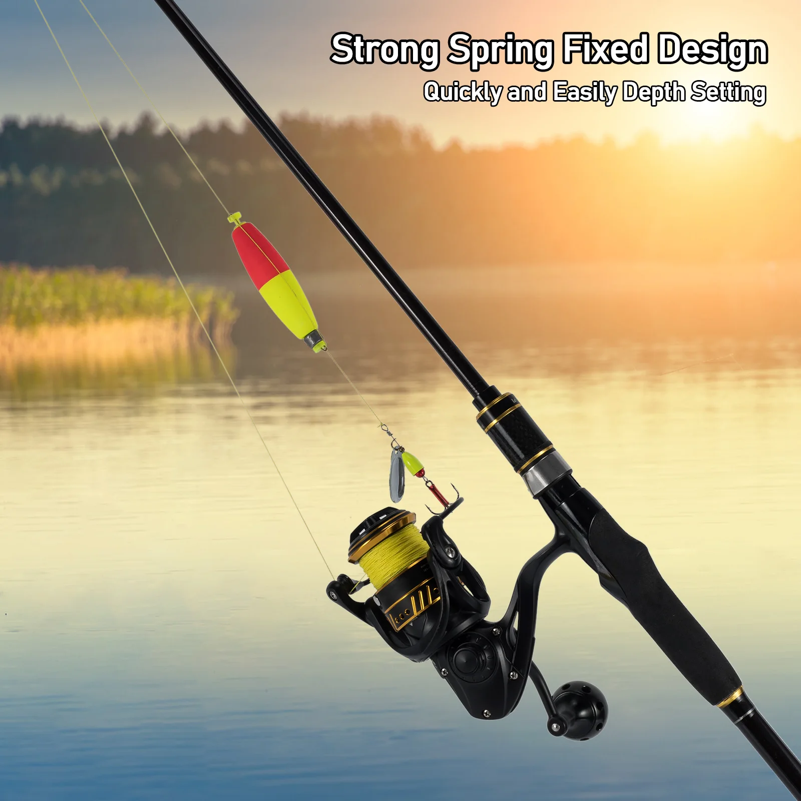 FLOTADORES SNAP-ON: Equipados con un diseño fijo de resorte de alta resistencia, los ganchos de resorte superior e inferior se pueden abrir y soltar fácilmente cerrados, lo que permite un ajuste de profundidad rápido y fácil, manteniendo el anzuelo y el cebo a la profundidad requerida.