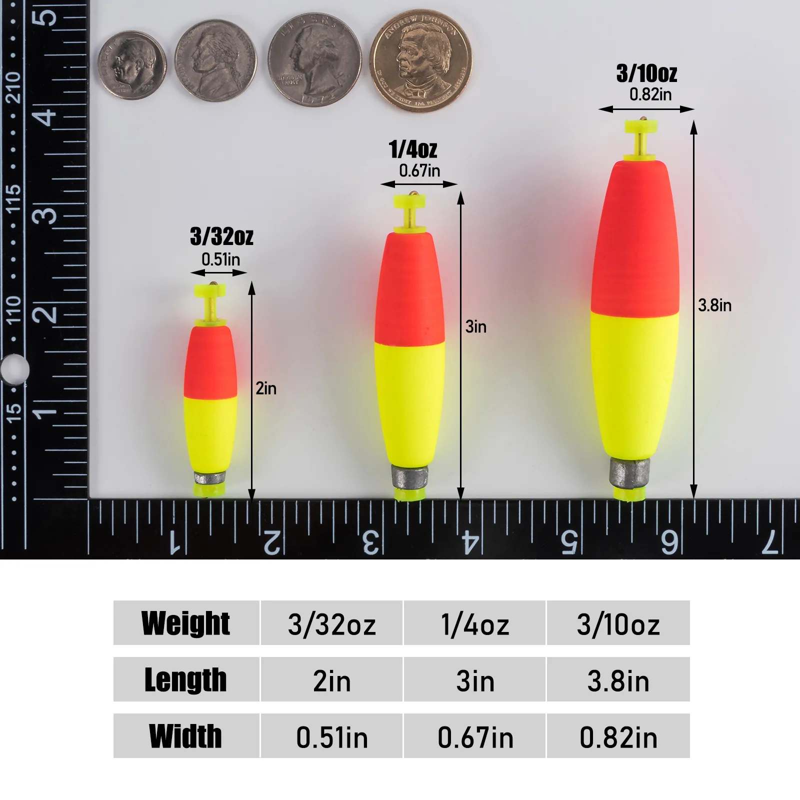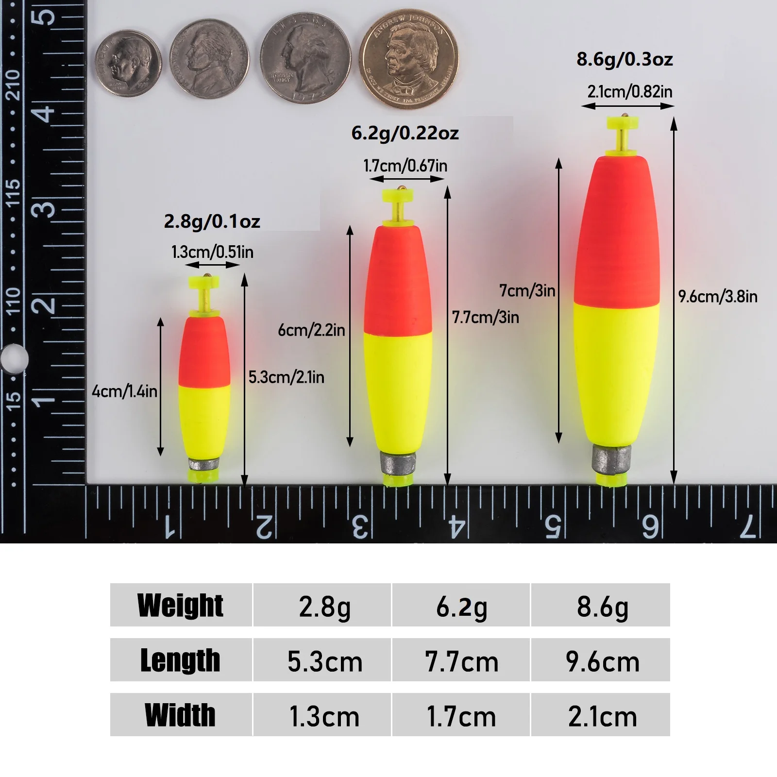 MATERIALES DE ALTA CALIDAD: Estos bobbers con peso están compuestos de espuma EVA, resorte, plástico ABS y plomo.Durable, no absorbente, no se deforma fácilmente y pesa más.