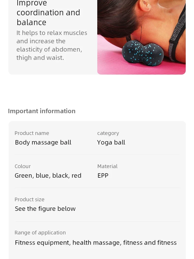 • Relajación muscular de alta densidad:Las bolas de maní EPP están hechas de espuma de alta densidad que proporciona un masaje de tejido profundo, ayudando a relajar los músculos y reducir el dolor.