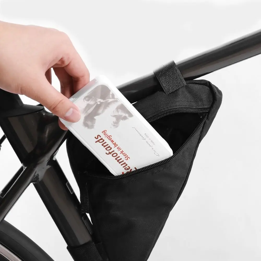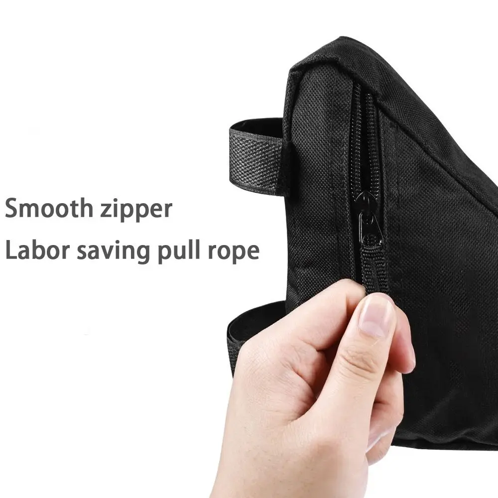 Especificaciones Material: tela impermeable Tipo: Bolsa de cuadro de bicicleta Ocasión: Actividad al aire libre: ciclismo/bicicleta Función: impermeable Aviso: no se puede remojar en agua Características 1. La bolsa de sillín de ciclismo se conecta fácilmente debajo del tubo superior de la bicicleta con correas ajustables para un ajuste personalizado. 2. Diseño de boca de apertura con cremallera grande para facilitar el acceso, con cierre de cremallera duradero, diseño de cuerpo delgado con alta capacidad para minimizar la resistencia al viento. 3. El material de poliéster resistente al agua y a la intemperie ayuda a proteger los artículos almacenados. 4. Se adapta a la mayoría de elementos esenciales como teléfonos inteligentes, BILLETERA, llaves y otros artículos pequeños. El paquete incluye 1 * BOLSA PARA BICICLETA