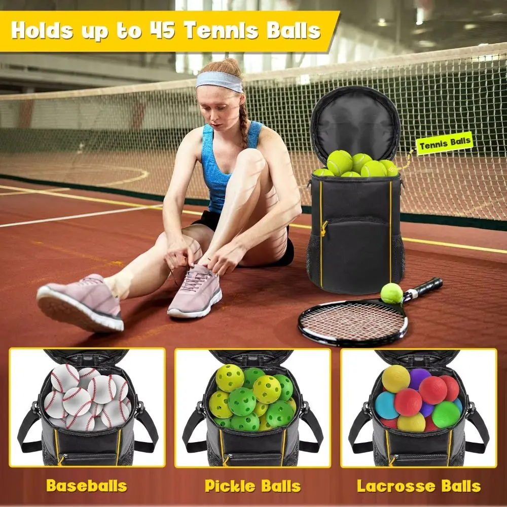 The tennis Balls bag main compartment can hold up to 45 tennis balls or pickleballs. The front pocket and two side meshes pockets can store your accessories like water bottles, phones, gloves.