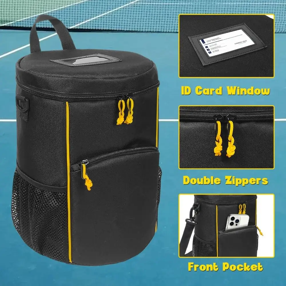 El compartimento principal de la bolsa para pelotas de tenis puede contener hasta 45 pelotas de tenis o pelotas de pickleball.El bolsillo frontal y los dos bolsillos laterales de malla pueden guardar sus accesorios como botellas de agua, teléfonos y guantes.