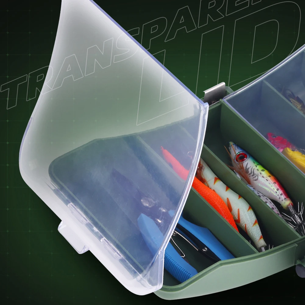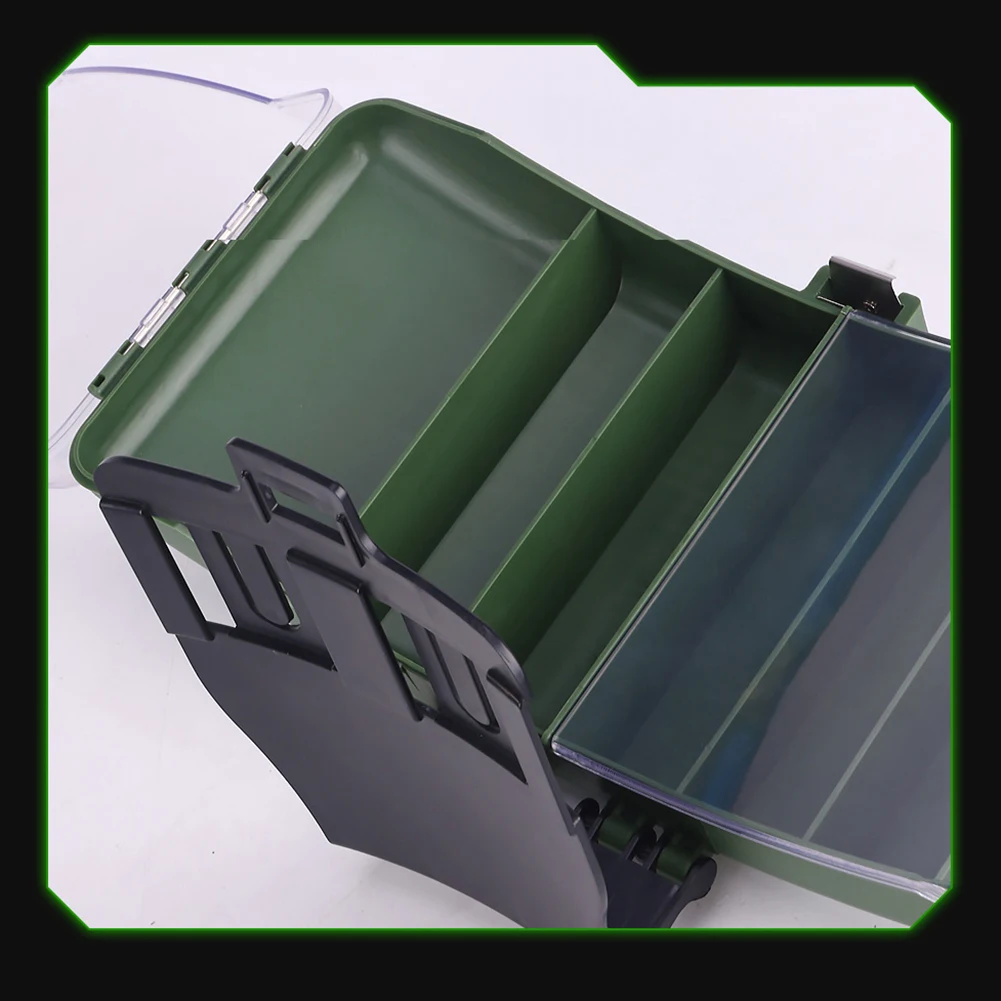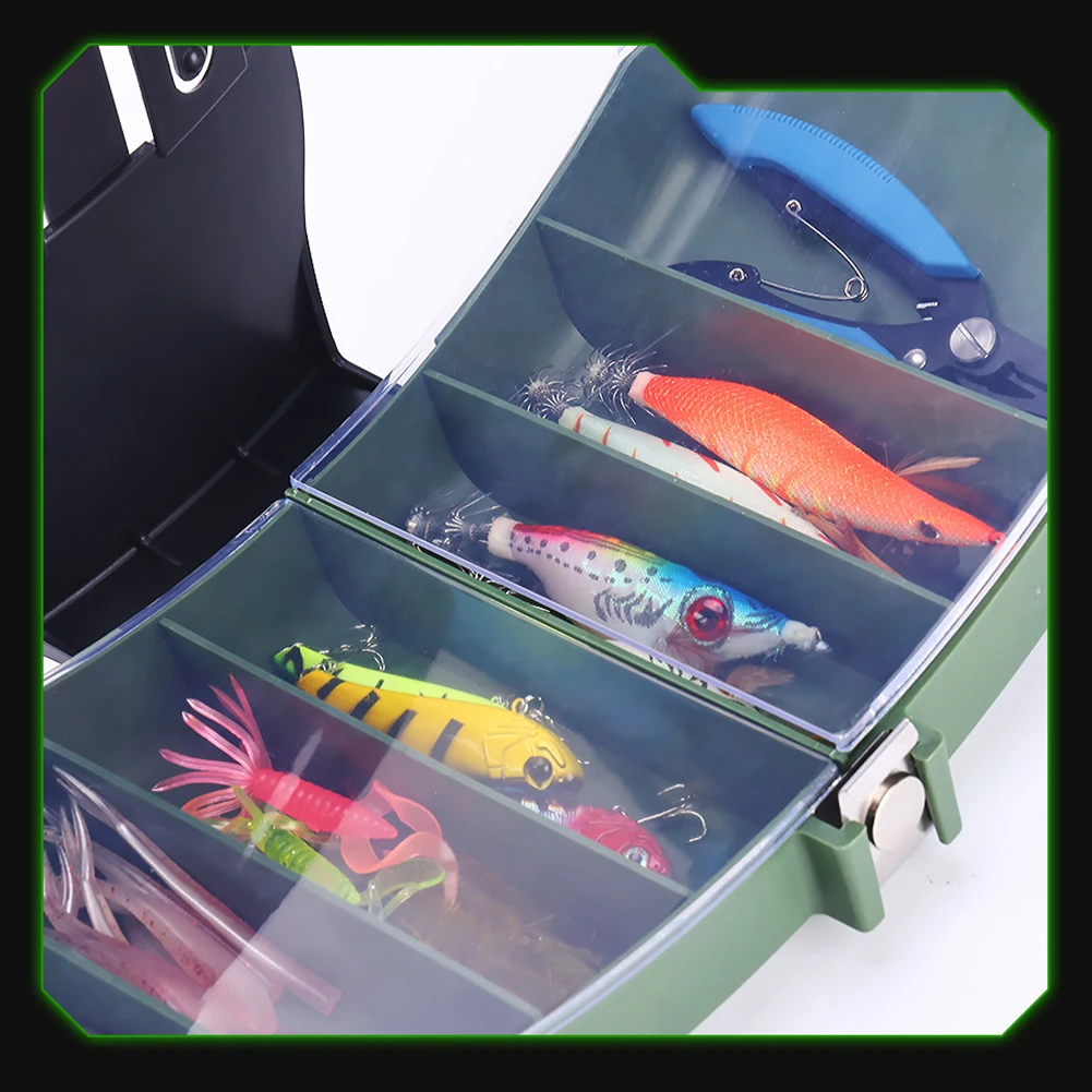Compartimentación integrada: La cubierta de la caja incluye pequeños compartimentos integrados para una mejor organización, proporcionando espacio para almacenar cebos, carretes, anzuelos, sedales y otras herramientas de pesca.