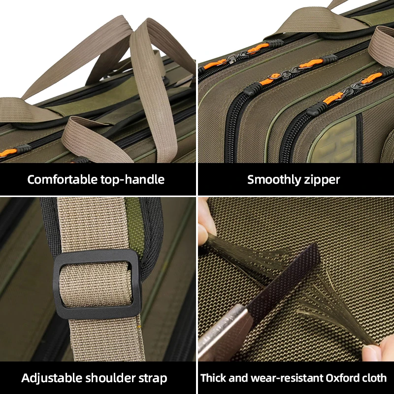 1.Gran capacidad y diseño multicapa, esta bolsa para caña de pescar ofrece un amplio espacio de almacenamiento para todo su equipo.