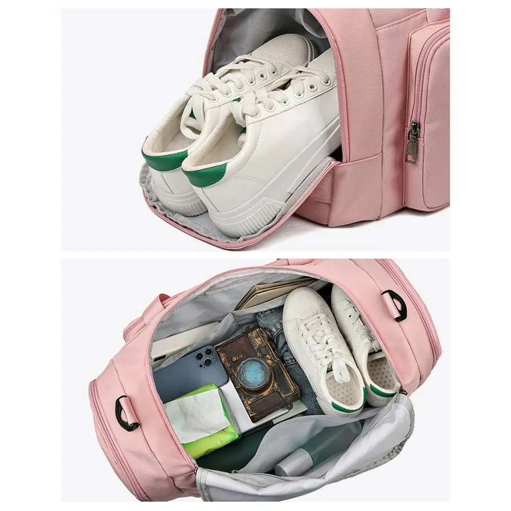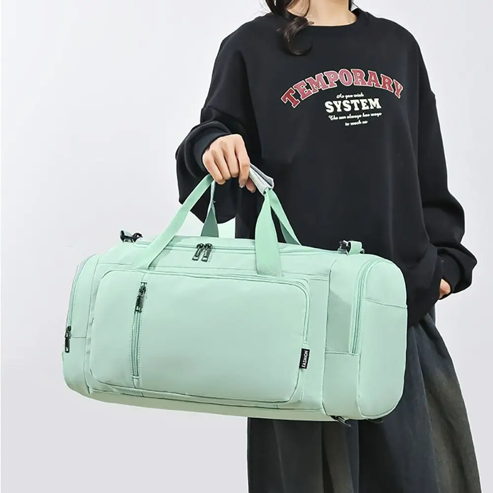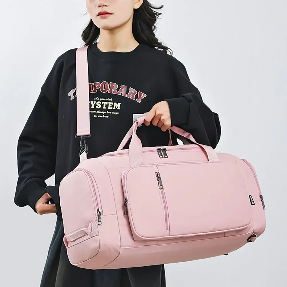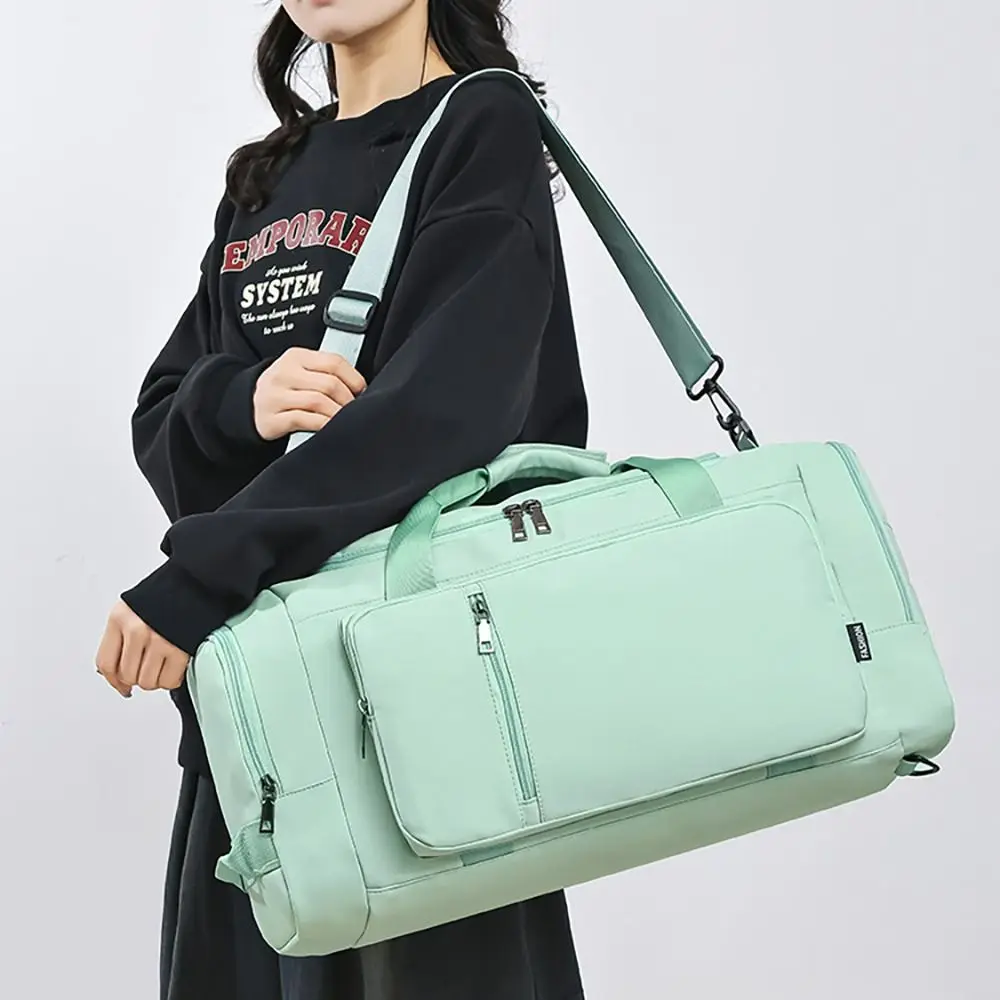 Made from water-resistant material, this bag boasts cushioned handles, a trolley sleeve, enhancing its functionality. Multi-pocket design, features accessible front pockets for essentials like earbuds and passports. Indepedent shoes storage pocket and with breathable hole for shoes storage pocket. This gym bag transitions seamlessly from a hand-held, single shoulder, to double-shoulder, and attaches to luggage for easy travel. This bag includes a zippered pocket for valuables and a waterproof PVC pouch, ensuring your dry and wet items remain separate. Designed for air travel, this duffel fits under seats and includes an external zip pocket for quick access to travel documents and snacks. Specifications: Type: Fitness Bag Material: Oxford, Polyester Size: Approx 53*24*24cm(20.87*9.45*9.45in) Colors: Pink, Black, Grey, Green, Blue, White Opening and closing method: zipper Usage: Single shoulder, crossbody, handheld, double shoulder Internal structure: main bag, zipper bag, dry wet separation bag, shoe bag Weight: 700g Notes: 1. Due to the light and screen setting difference, the item's color may be slightly different from the pictures. 2. Please allow slight dimension difference due to different manual measurement. 3. 1cm=0.39in. Package Content: 1 x Fitness Bag