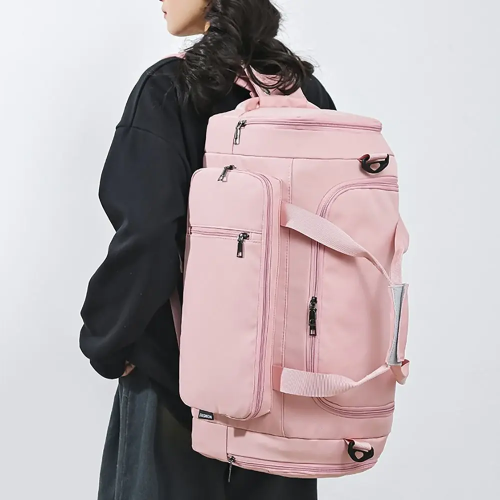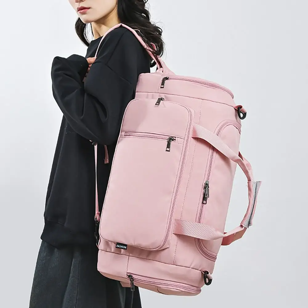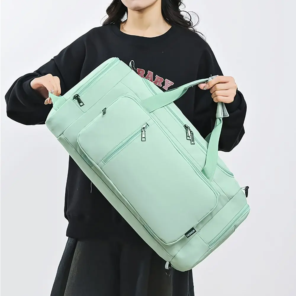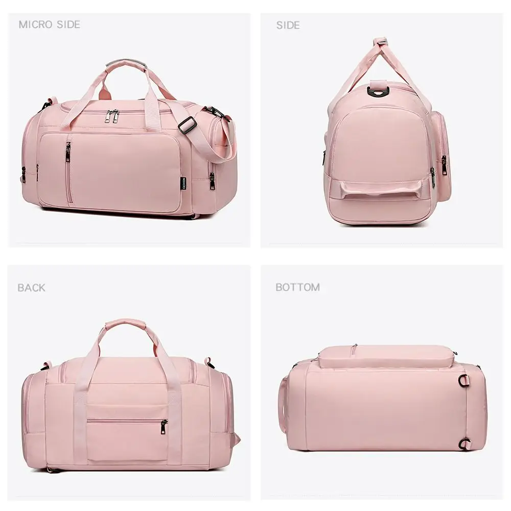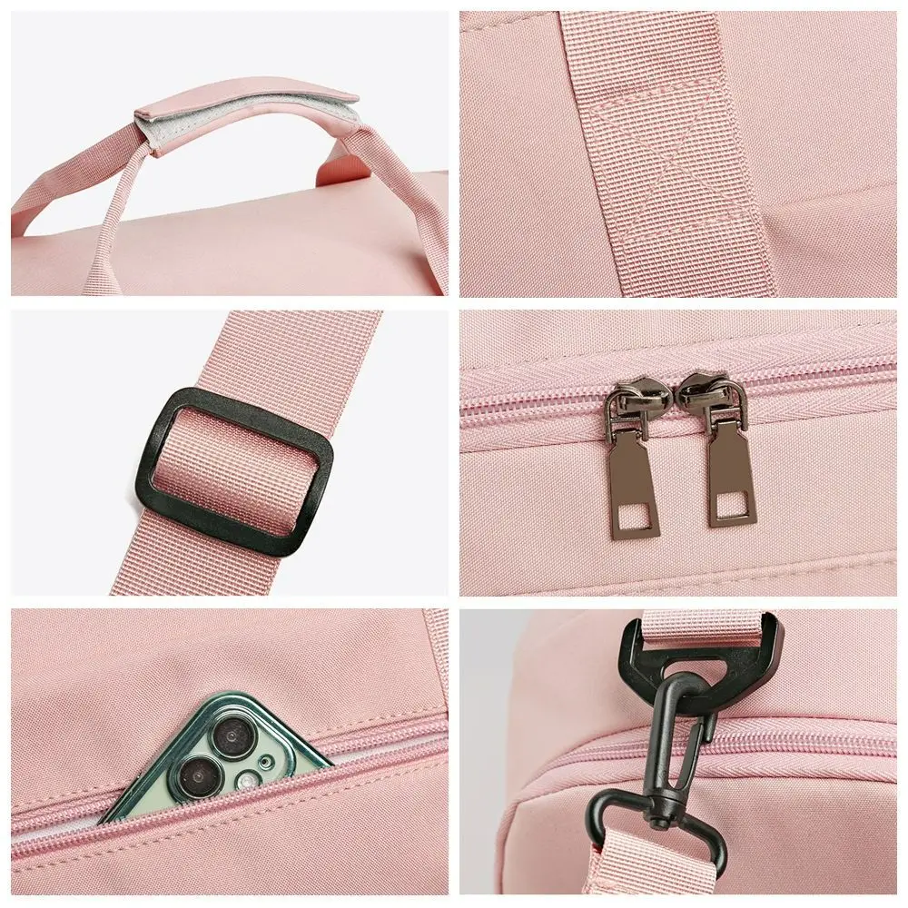 Made from water-resistant material, this bag boasts cushioned handles, a trolley sleeve, enhancing its functionality. Multi-pocket design, features accessible front pockets for essentials like earbuds and passports. Indepedent shoes storage pocket and with breathable hole for shoes storage pocket. This gym bag transitions seamlessly from a hand-held, single shoulder, to double-shoulder, and attaches to luggage for easy travel. This bag includes a zippered pocket for valuables and a waterproof PVC pouch, ensuring your dry and wet items remain separate. Designed for air travel, this duffel fits under seats and includes an external zip pocket for quick access to travel documents and snacks. Specifications: Type: Fitness Bag Material: Oxford, Polyester Size: Approx 53*24*24cm(20.87*9.45*9.45in) Colors: Pink, Black, Grey, Green, Blue, White Opening and closing method: zipper Usage: Single shoulder, crossbody, handheld, double shoulder Internal structure: main bag, zipper bag, dry wet separation bag, shoe bag Weight: 700g Notes: 1. Due to the light and screen setting difference, the item's color may be slightly different from the pictures. 2. Please allow slight dimension difference due to different manual measurement. 3. 1cm=0.39in. Package Content: 1 x Fitness Bag
