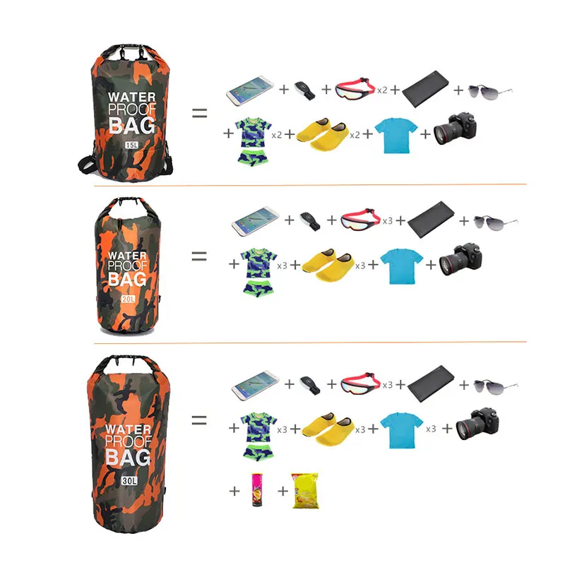 Nuestra bolsa seca a prueba de agua es de fácil operación y limpieza: Simplemente coloque su equipo en la bolsa, agarre la cinta tejida superior y ruede firmemente de 3 a 5 veces y luego cierre la hebilla para sellar completamente, todo el proceso es muy rápido.