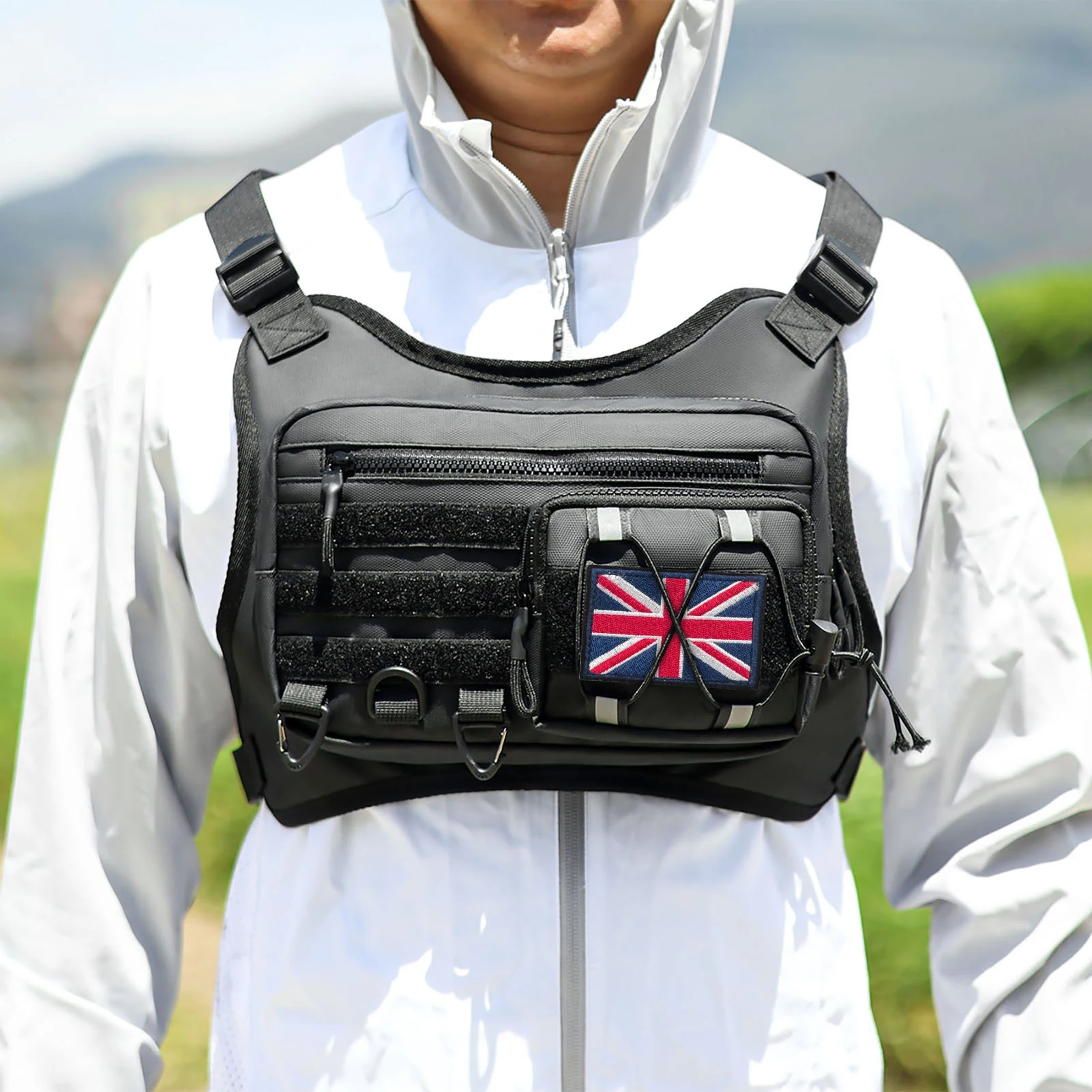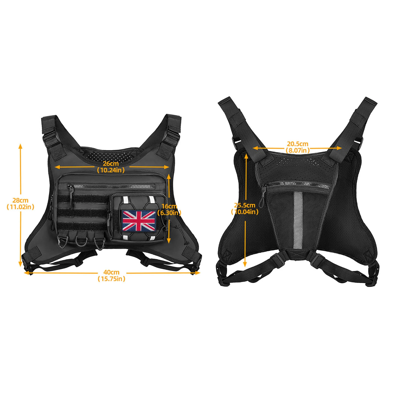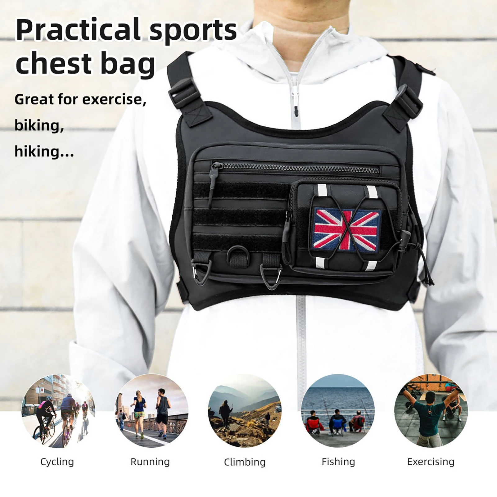 1.Material impermeable: hecha de poliéster 900D, esta bolsa de pecho ofrece protección impermeable para sus pertenencias.