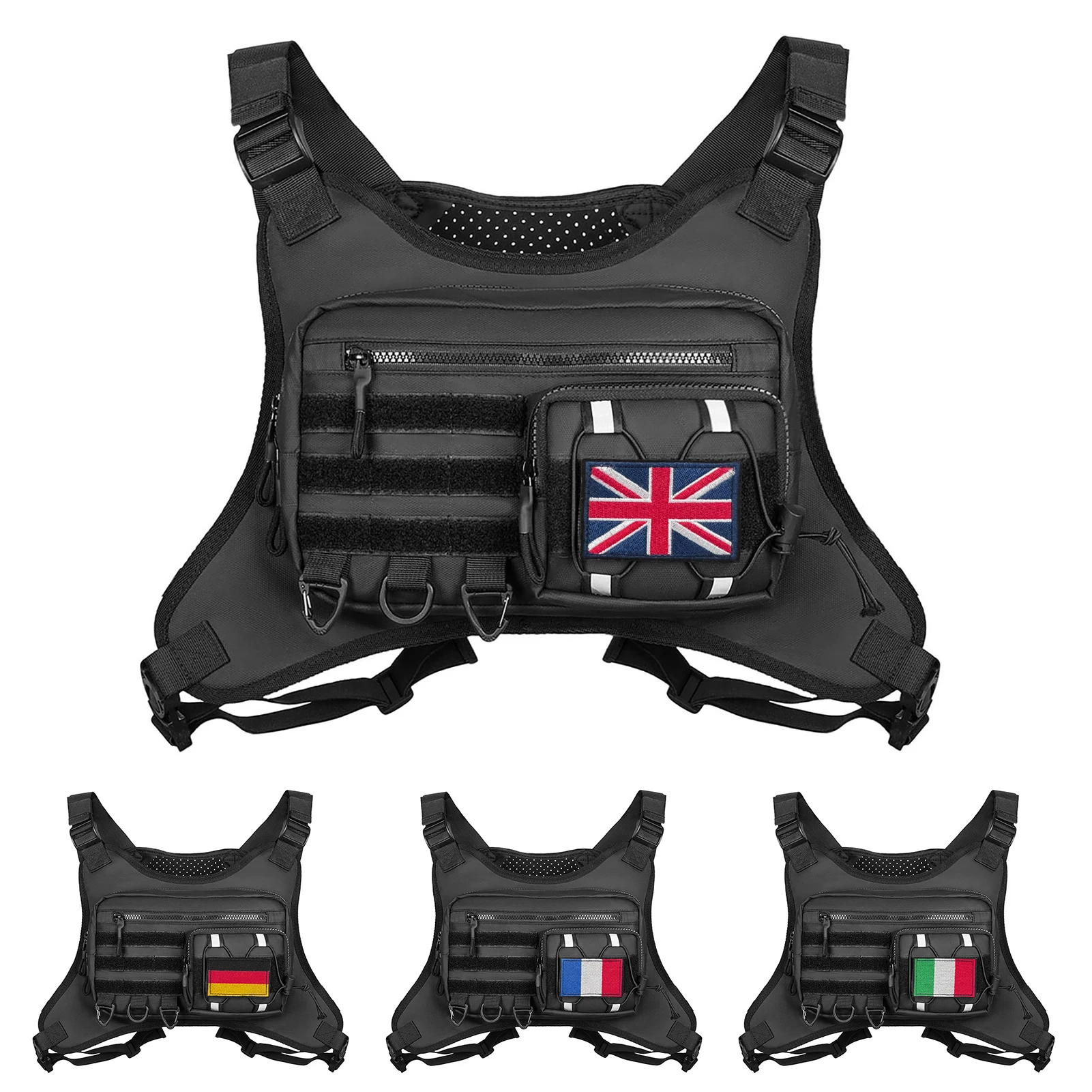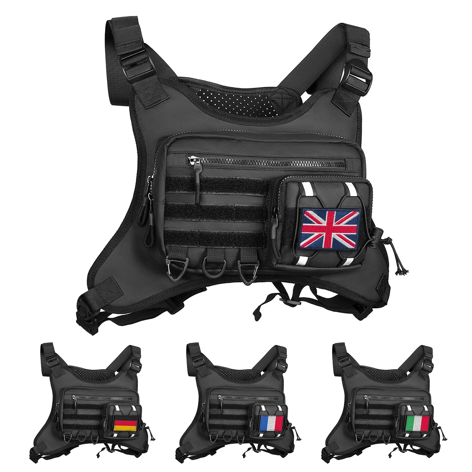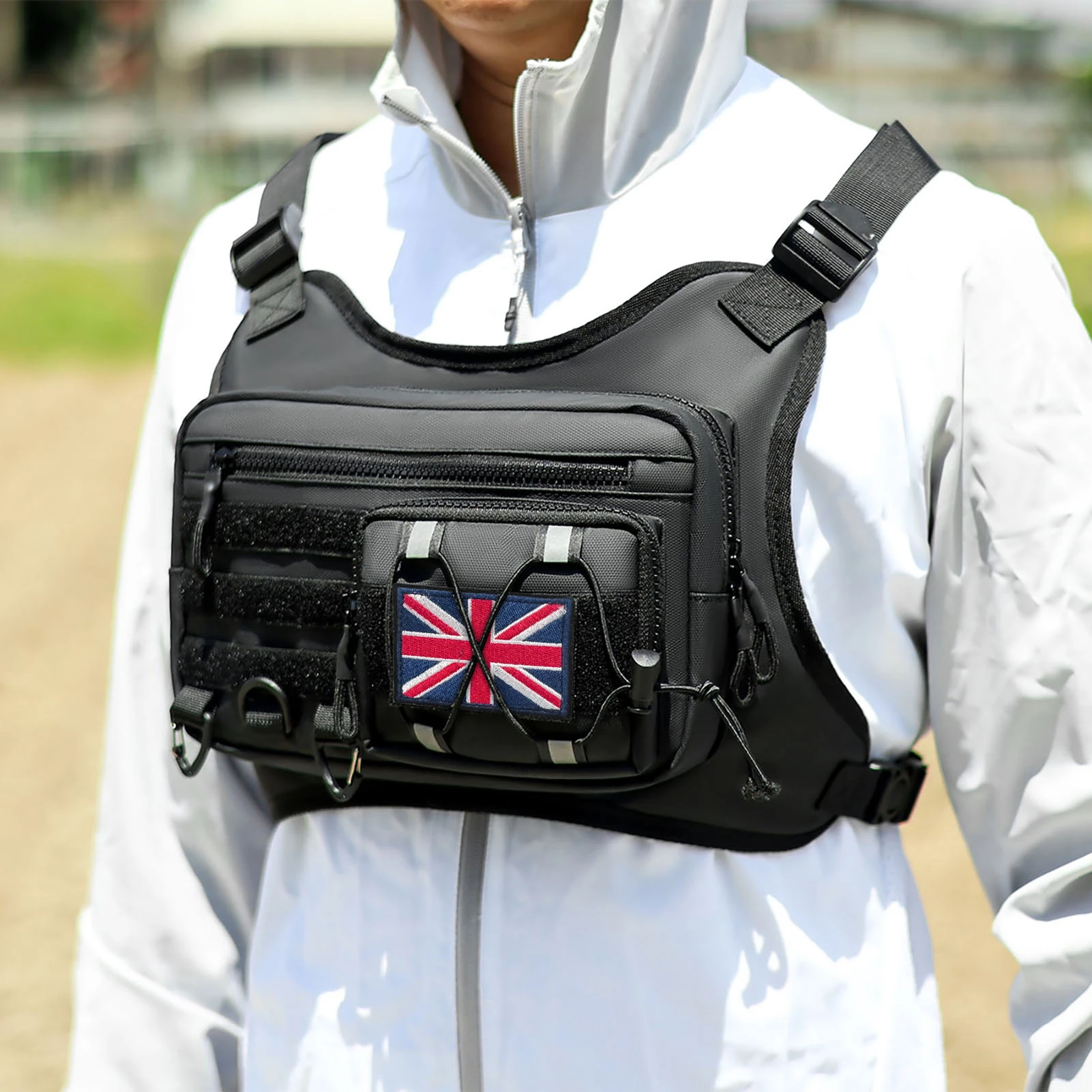 1.Material impermeable: hecha de poliéster 900D, esta bolsa de pecho ofrece protección impermeable para sus pertenencias.