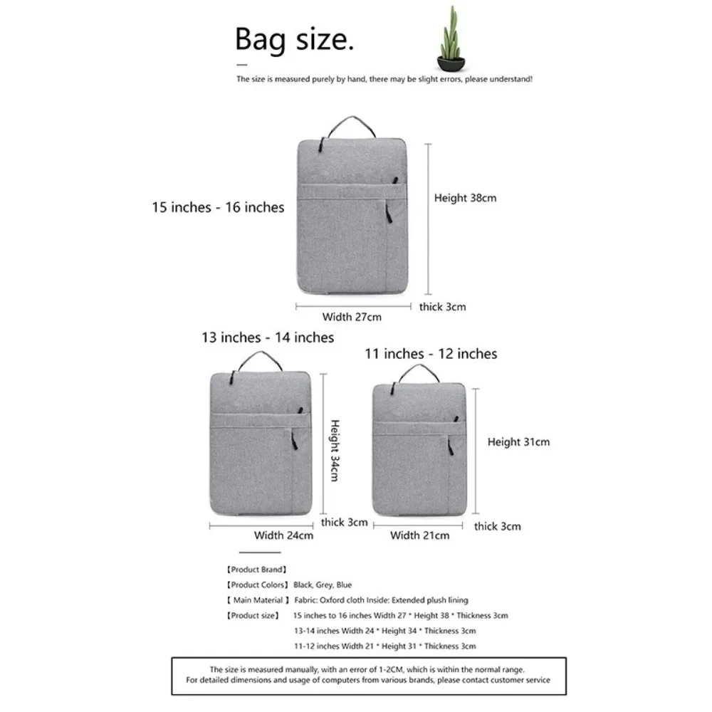 Size:11/12inch:31*21*3cm(12.20*8.27*1.18in),13/14inch:34*24*3cm(13.39*9.45*1.18in),15/16inch:38*27*3cm(14.96*10.63*1.18in)