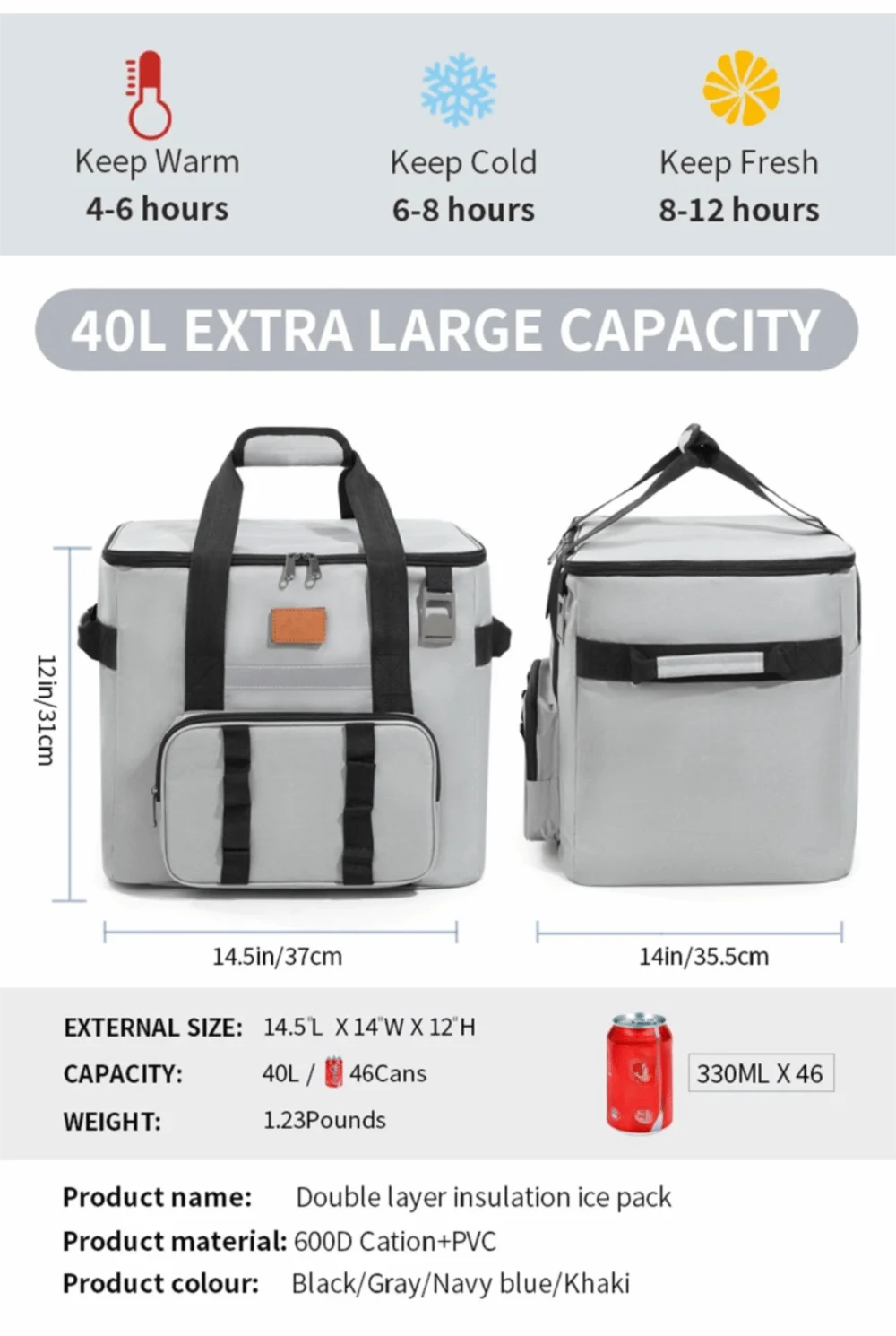 -Advanced Temperature Control.5-layer tech: Oxford/PVC/210D/PEVA.6hrs cold - 8hrs fresh - 4hrs warm