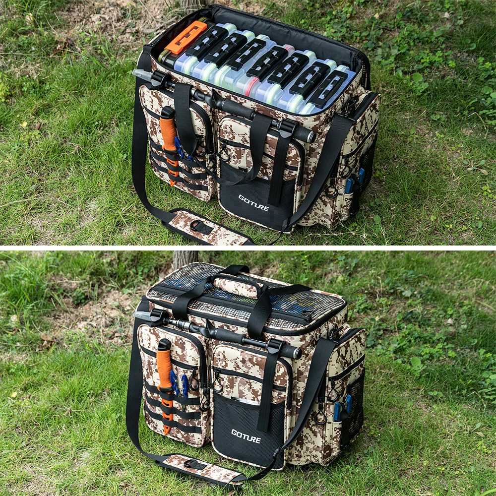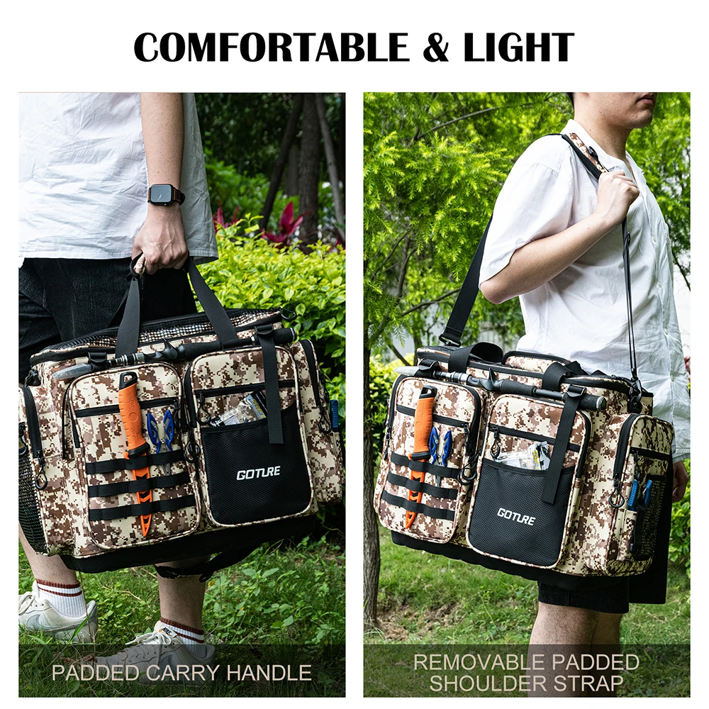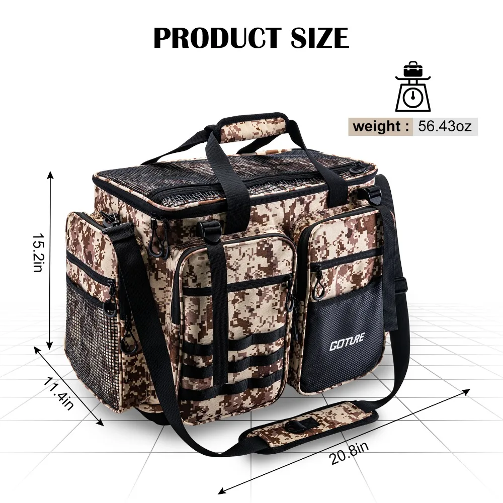 1.Tamaño del cuerpo de la bolsa de equipo de pesca: largo * ancho * alto 53 * 29 * 38,5 cm