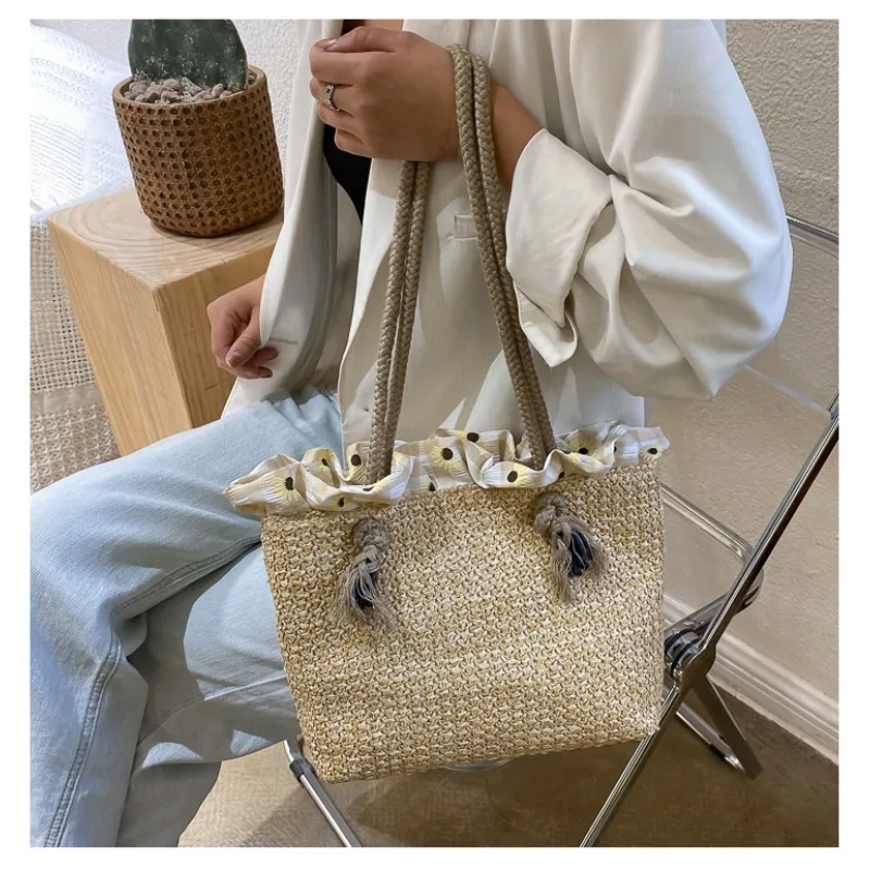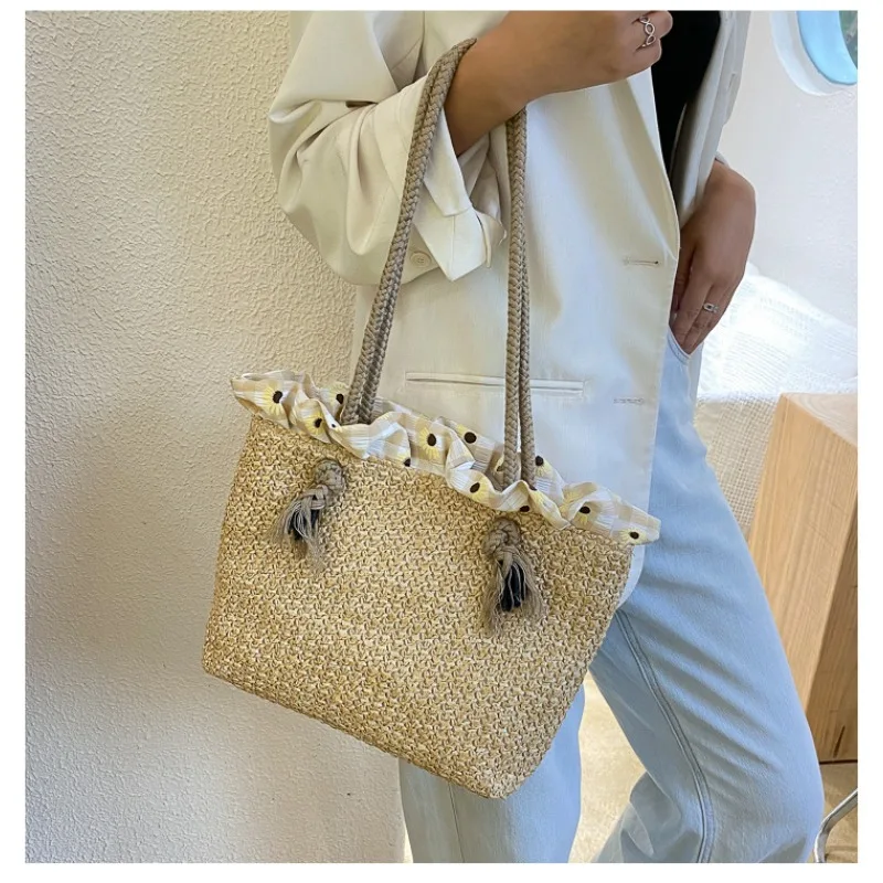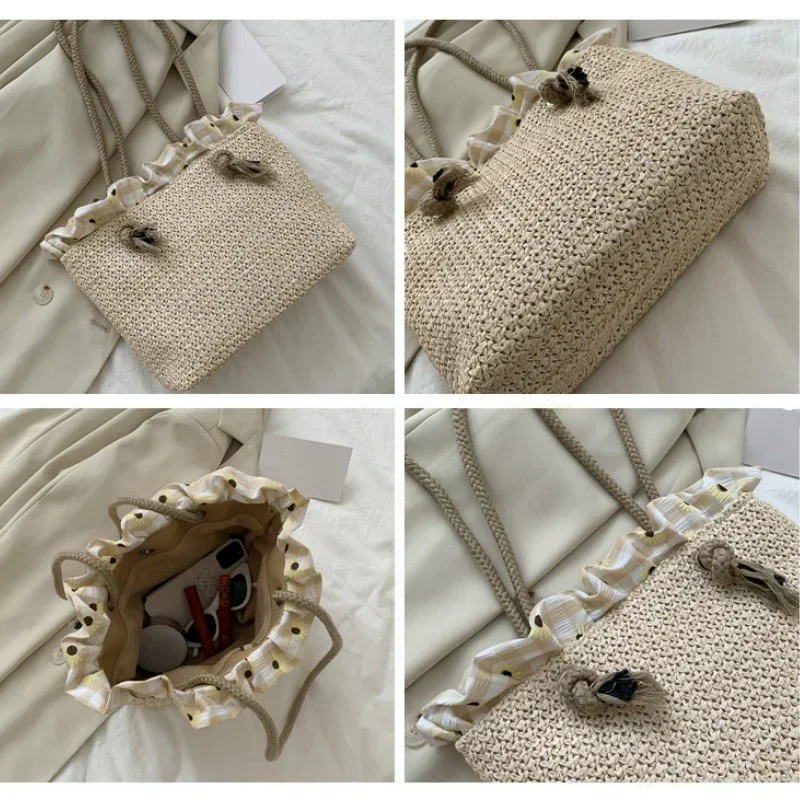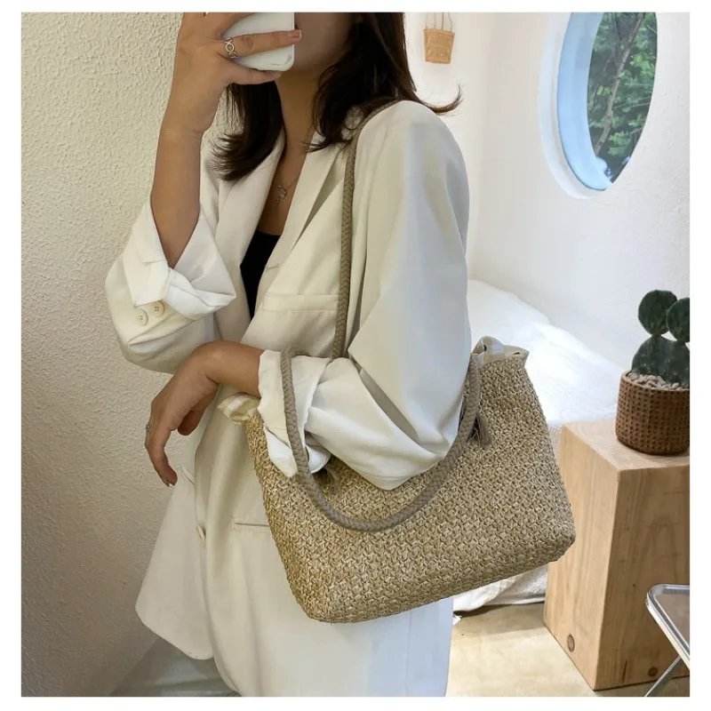 Bolso tejido de hierba de verano, bolso de hombro tejido informal de gran capacidad con edición coreana a la moda para mujer