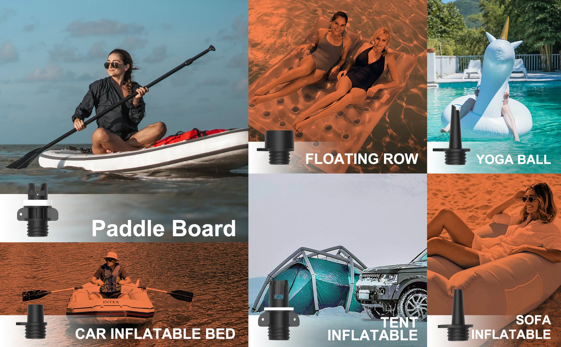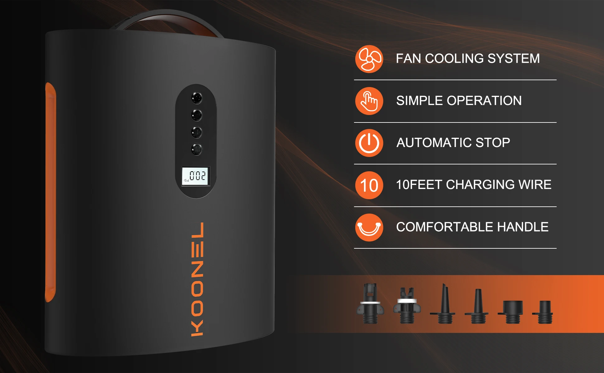 【 6 boquillas de aire 】la bomba eléctrica koonel ofrece 6 boquillas diferentes para cubrir todas las recreaciones inflables, incluyendo tablas de paddle inflables de pie, piscinas, tiendas de campaña y colchones, etc.
