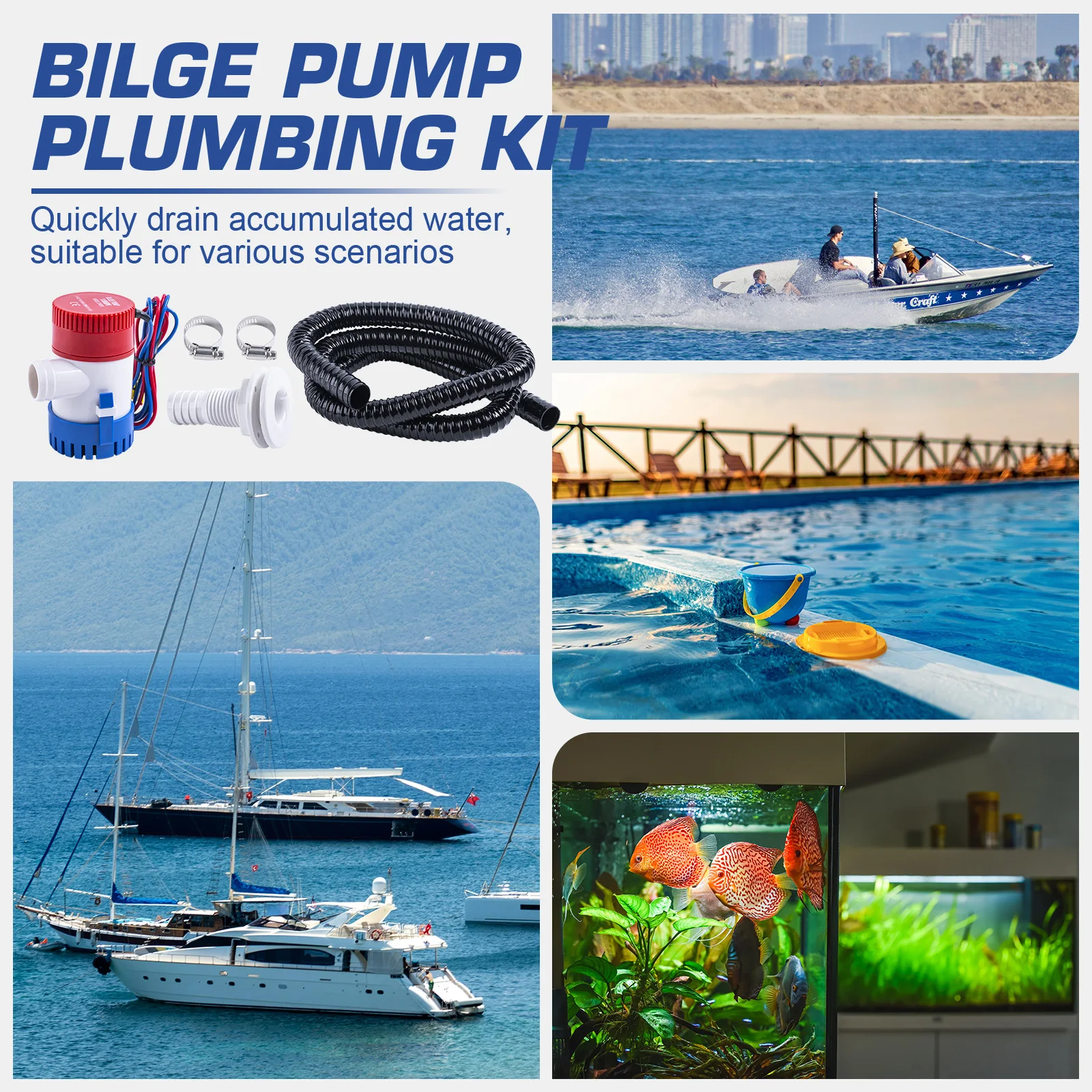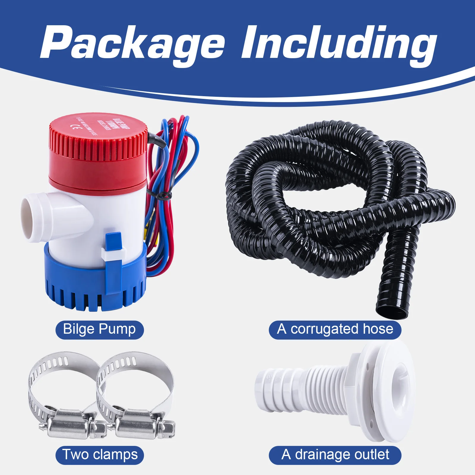 Paquete completo: El paquete de bomba de achique incluye una bomba de achique eléctrica de 1100 GPH y 12 V, una manguera corrugada de 6 pies, 2 abrazaderas de acero inoxidable y 1 salida de agua.Este conjunto completo proporciona todos los componentes necesarios para una gestión eficaz del agua de achique y una fácil instalación.