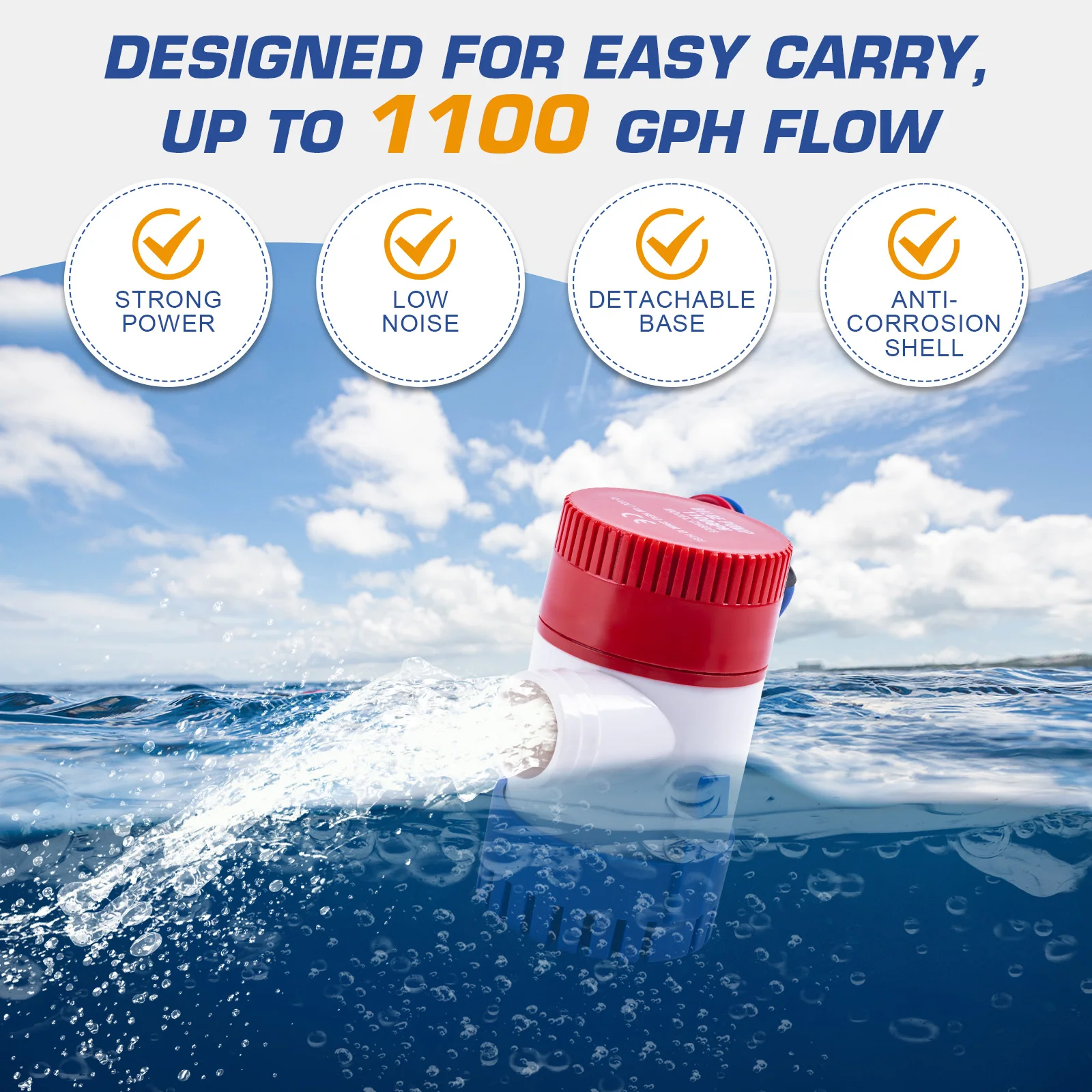 Especificaciones versátiles: Disponible en tres especificaciones diferentes, la bomba de achique se puede seleccionar según necesidades específicas. Es adecuado para diversas aplicaciones, incluido el uso en el fondo de embarcaciones, piscinas y peceras, brindando flexibilidad para diferentes escenarios.
