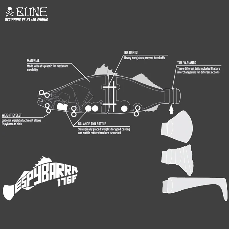 El BONE ESPYBARRA 176F es un Swimbait articulado flotante multifunción. Construido con plástico ABS extremadamente duradero, presenta una sección de articulación media y viene con 3 tipos de cola intercambiables que producen diferentes acciones de natación. La cola de cebo deslizante predeterminada le da un bamboleo estándar de lado a lado. Cambiar La cola es fácil tirando de la cola hacia arriba. La cola de "paleta extendida" cambia la acción a un bamboleo más sutil de lado a lado, con un remo atractivo de la cola que provocará la mordida. La cola "Fluke" le da a ESPYBARRA la acción de tambaleo más ancha de lado a lado. La ESPYBARRA también es tan versátil cuando se trata de su flotabilidad. Agregue un plomo al ojal inferior frontal para permitir que la ESPYBARRA flotante se hunda, apuntando a columnas de agua más profundas cuando sea necesario.