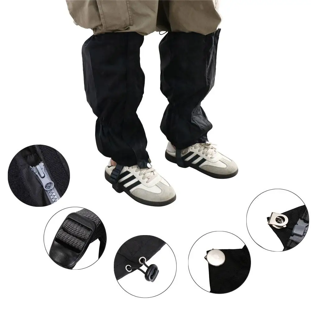 ADJUSTABLE FOR TIGHT FIT - Our leg gaiters can be adjusted to fit everyone.Adjustable drawstring guarantees a tight fit around your calf and no-loose-off while the long lasting belt with buckle on the bottom can adjust the length. The reinforced hook on the bottom prevents the leg gaiters from detaching your shoes.