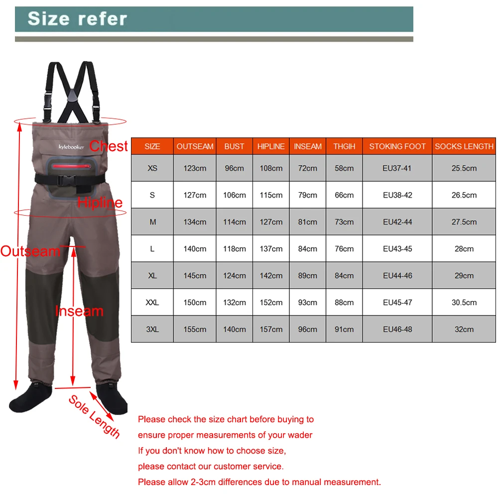 Medidas de la talla:Atención: el tamaño de las waders se mide manualmente, por lo que hay ciertas diferencias. Si tienes alguna pregunta antes de comprar, déjanos un mensaje sin dudarlo.