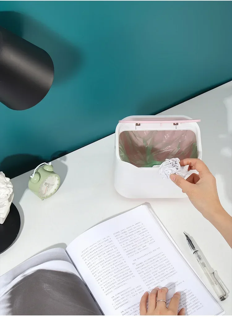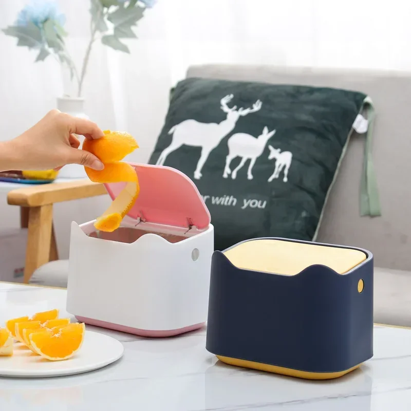 Bote de basura de escritorio tipo prensa, Mini cocina, bonito dibujo animado con tapa, tocador para dormitorio, caja de almacenamiento de basura para oficina