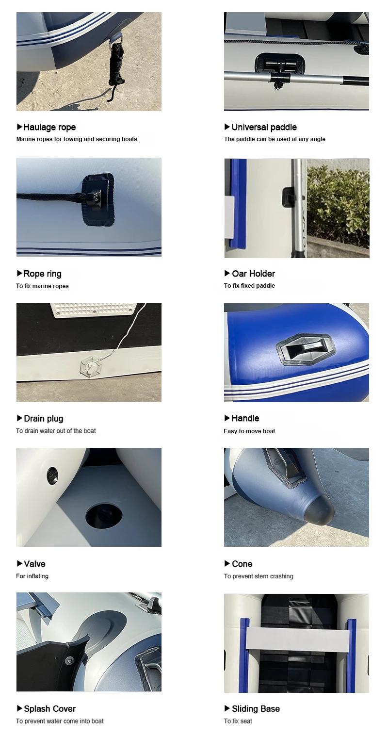 4.Incluye un par de remos de 2 piezas con cierres para ayudar a navegar y maniobrar por el agua, una cuerda de remolque, una bomba de inflado y un kit de reparación;