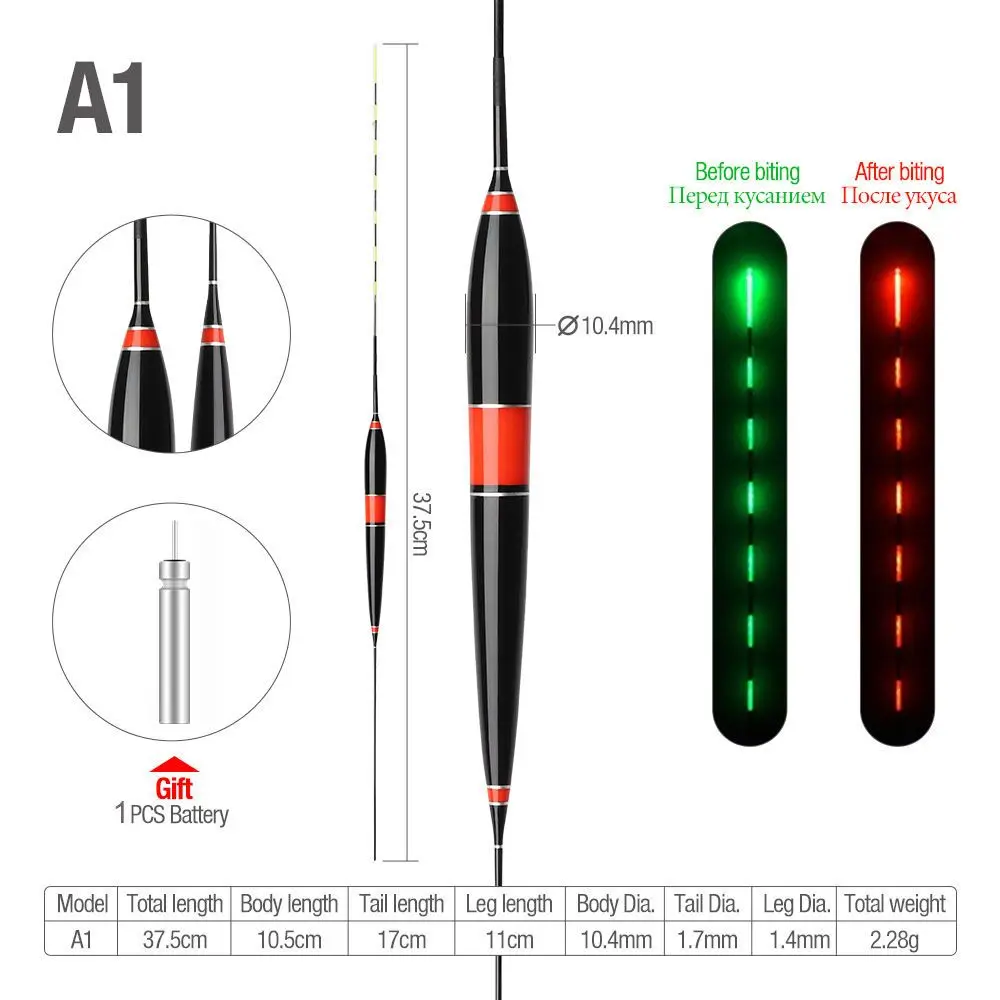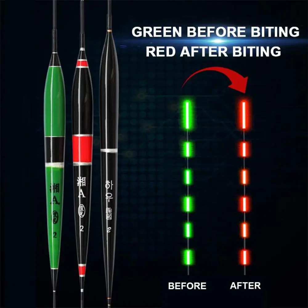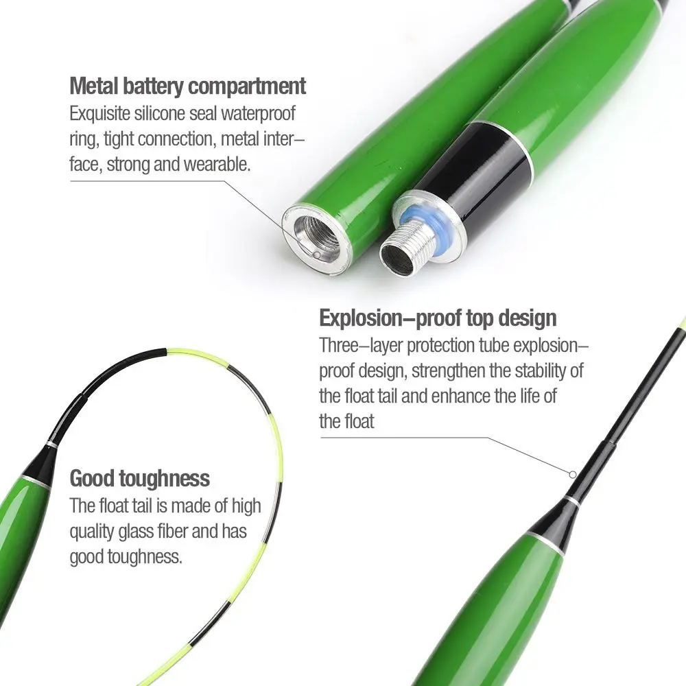 Nuevo diseño, flotadores de pesca inteligentes, función de sensor de gravedad. Cuando los peces pican, las luces cambian de verde a rojo, cuando solo hay olas, las luces mantienen el mismo verde. Fibra óptica de alto brillo, buen rendimiento en la transmisión de luz. Se adapta a diversos entornos de pesca. El paquete incluye: 1 flotador de pesca + 1 Batería
