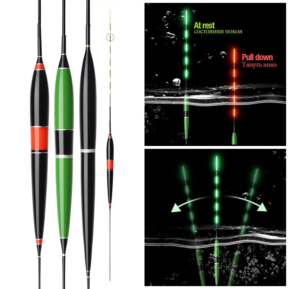Nuevo diseño, flotadores de pesca inteligentes, función de sensor de gravedad. Cuando los peces pican, las luces cambian de verde a rojo, cuando solo hay olas, las luces mantienen el mismo verde. Fibra óptica de alto brillo, buen rendimiento en la transmisión de luz. Se adapta a diversos entornos de pesca. El paquete incluye: 1 flotador de pesca + 1 Batería