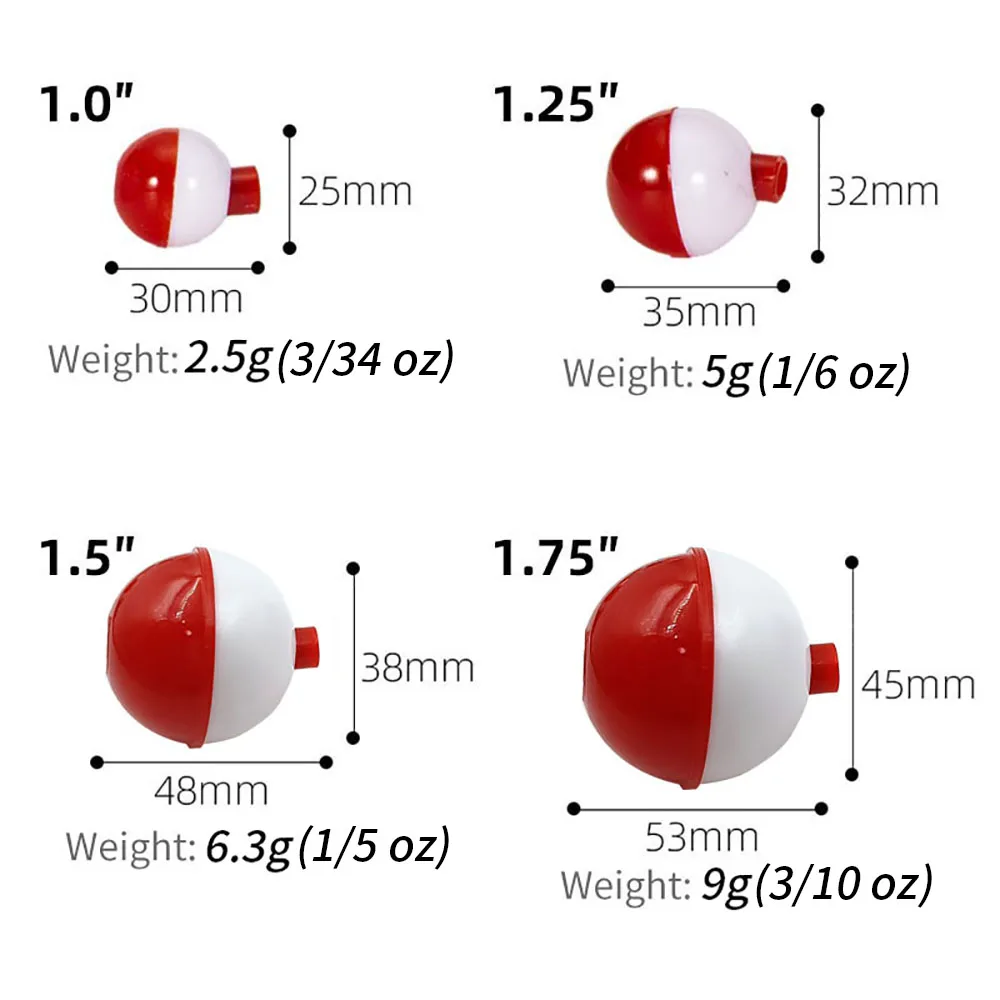 Tamaño de los flotadores: 1 pulgada, 1,25 pulgadas, 1,5 pulgadas, 1,75 pulgadas, 2 pulgadas.