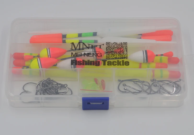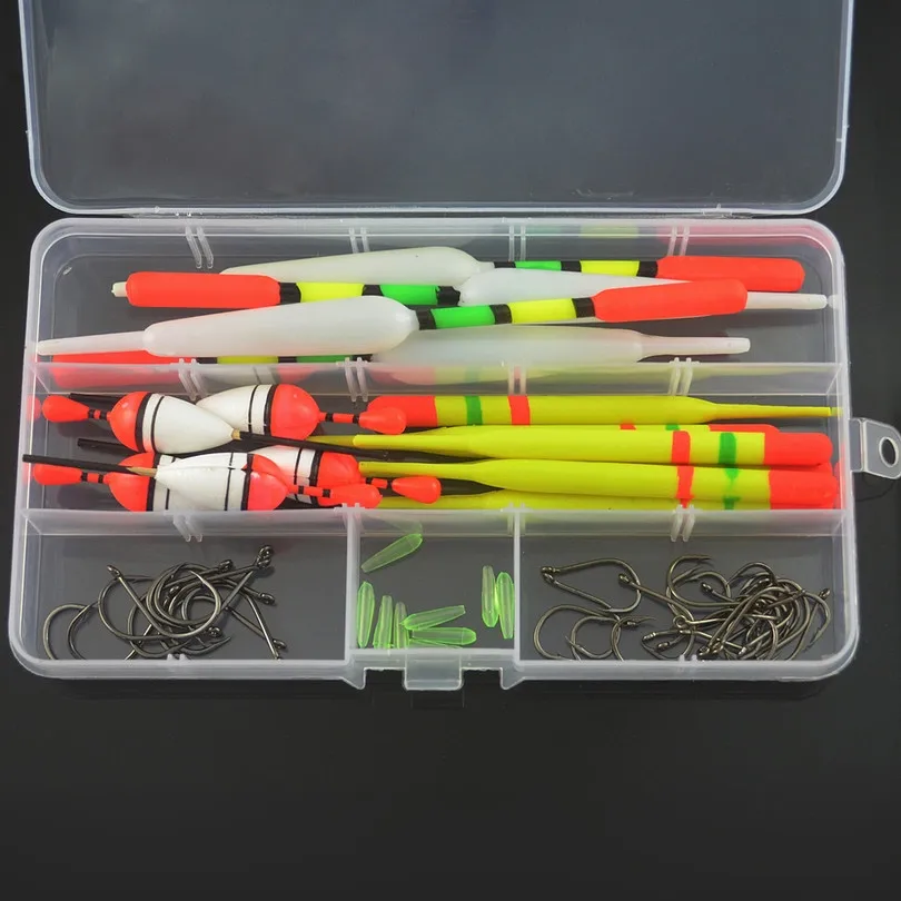 Boyas flotantes de pesca verticales de 3 tamaños, boya de aparejos de pesca Bobber con caja de aparejos gratis + combinación de 30 Uds. De ganchos, 15 Uds.