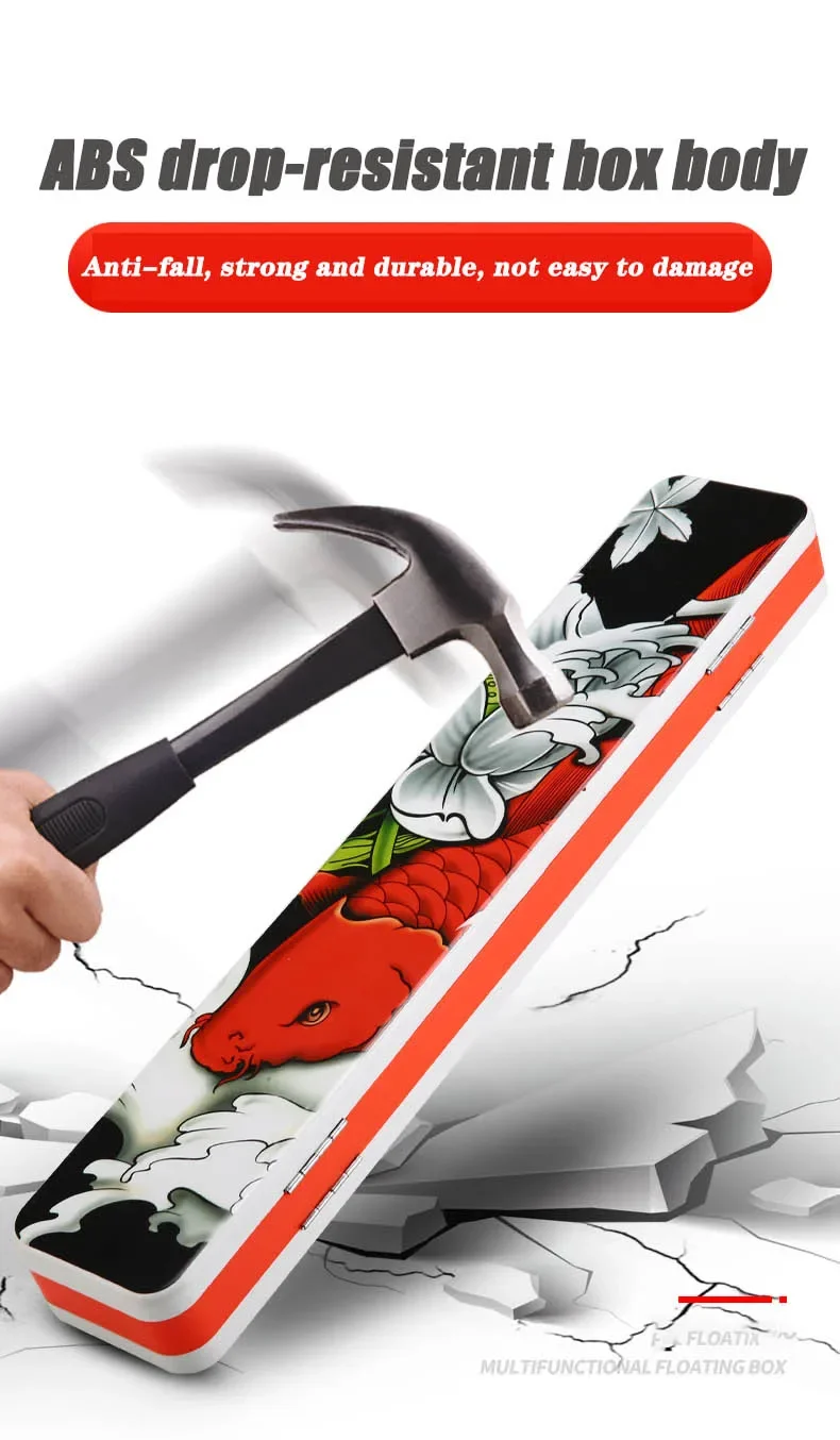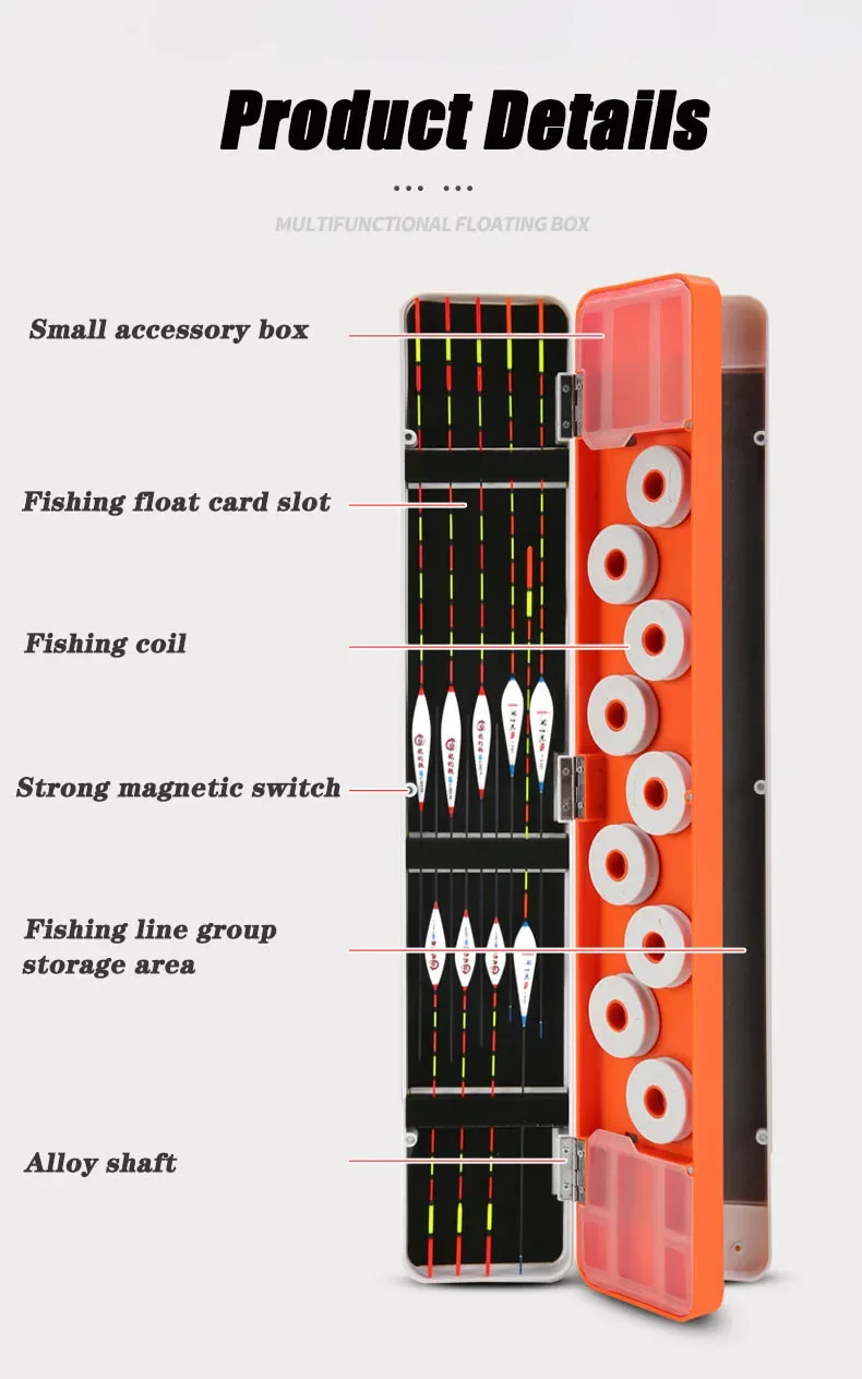 Función: puede almacenar flotador de pesca, grupo de sedal de pesca, cajas de almacenamiento en ambos lados pueden almacenar varios accesorios pequeños, interruptor de succión magnético fuerte, material ABS anticaída.