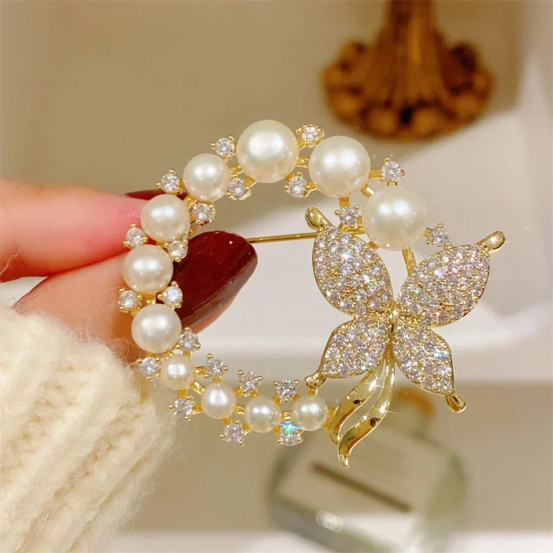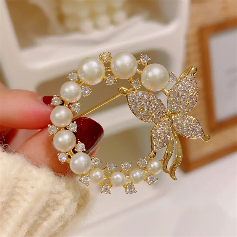 Broche de mariposa de corona de diamantes de imitación de perlas para mujer, alfileres circulares elegantes de moda barroca, regalos de boda de fiesta, nuevo
