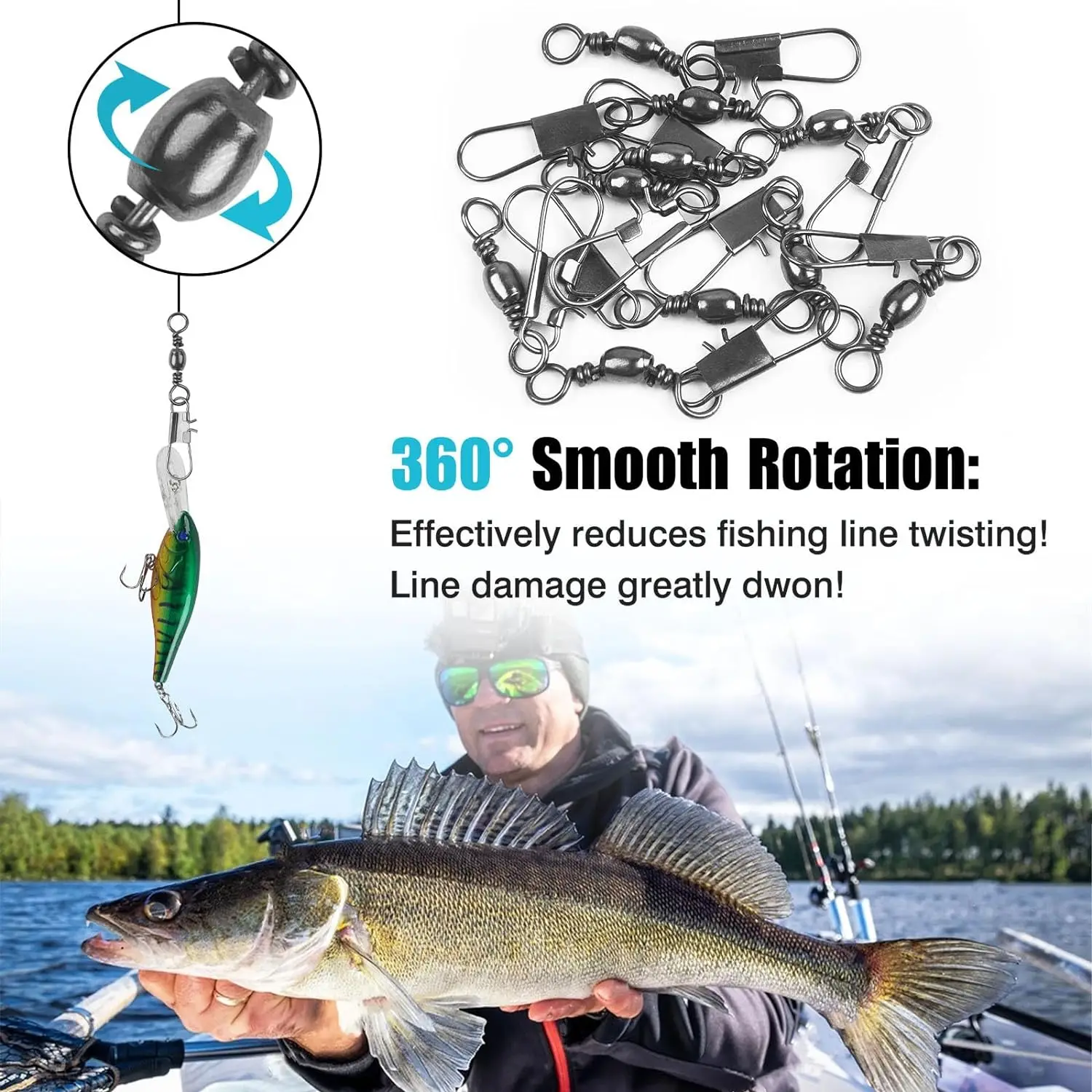 1. El broche giratorio de pesca hecho de cobre sólido y acero inoxidable, de construcción robusta, garantiza una alta resistencia.