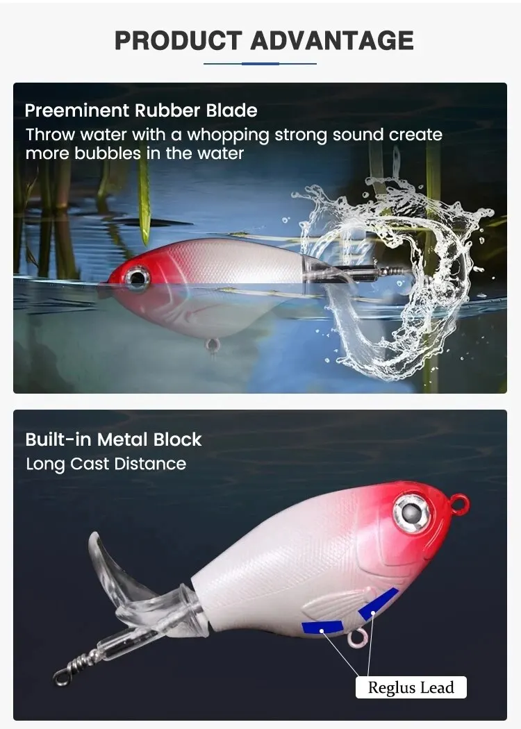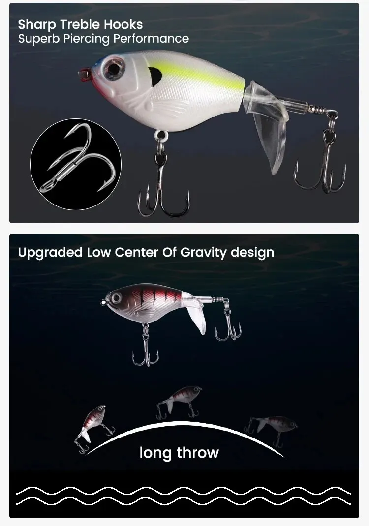 • Apariencia única :Con su diseño único de tractor y alas móviles, este señuelo se destaca en el agua, lo que lo hace más visible para los peces y aumenta sus posibilidades de una captura exitosa.